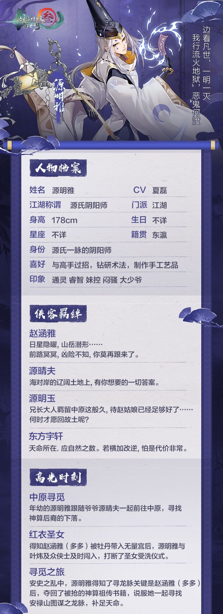 一图流带你深入了解【源氏一脉的阴阳师·源明雅】!想知道他有哪些高光时刻与侠客羁绊?下图带你30秒探明人物设定!↓(三妹小提示:游戏内人设界面也可同步查看源明雅相关内容噢!)