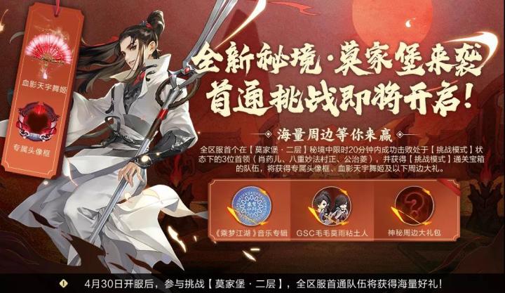 家堡首通活动若少侠达成全区全服首次在【莫家堡·二层】秘境中限时20分钟内成功击败处于【挑战模式】状态下的3位首领(肖药儿、八重妙法村正、公治菱)并获得【挑战模式】通关宝箱首通团队则将获得三妹准备的首通专属荣誉头像框【血舆吟】可交互背部挂件【血影天宇舞姬】以及海量周边大礼包噢~莫家堡Boss一览三妹特别提示!全新团队秘境【莫家堡·二层】内含2档首领挑战难度【普通模式】&【挑