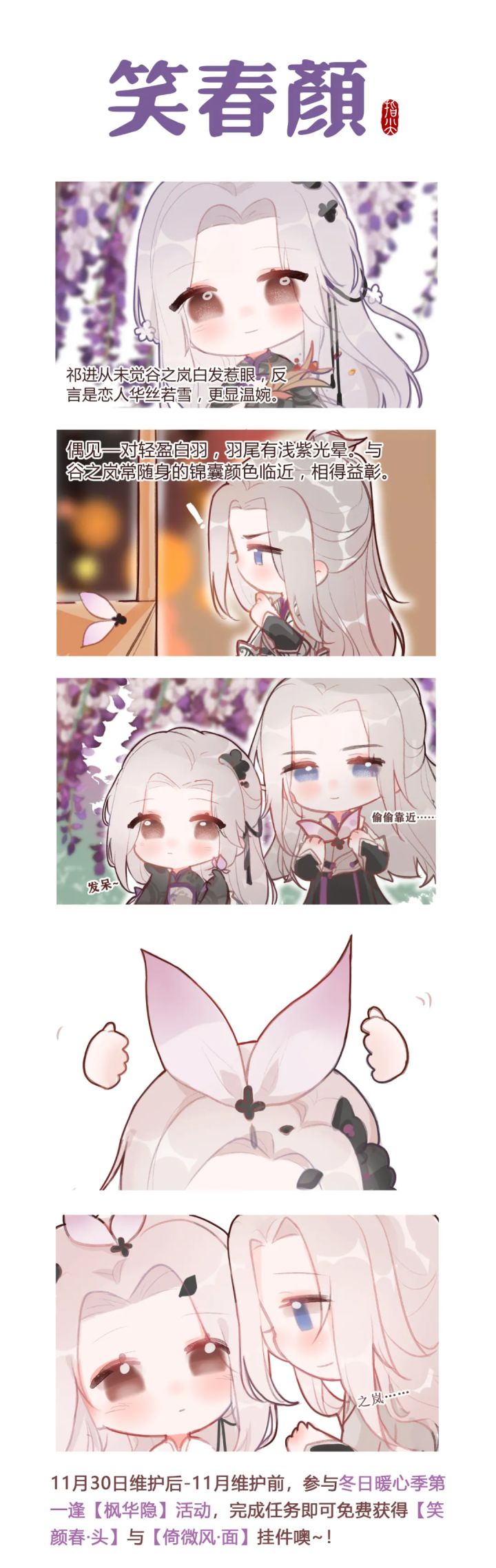 今天又是3妹磕甜甜故事的一天。冬日暖心季·第一逢故事已开启。完成今日【枫色载酒入襟怀】任务可得到【幽岚图】*20,累积完成5段任务还能得到谷之岚同款【笑春颜·头】噢~枫华谷副本Boss抢先看枫林啸山雨螭虎踞乾川还有以下信息需要少侠关注噢~