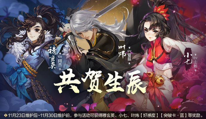 小七、穆玄英、叶炜生辰礼活动将于【11月23日维护后-11月30日维护前】限时开启!少侠们记得到游戏内为他们庆生噢!侠客突破卡、好感度等好礼等你来拿!活动期间,三位侠客出战秘境还有buff加成