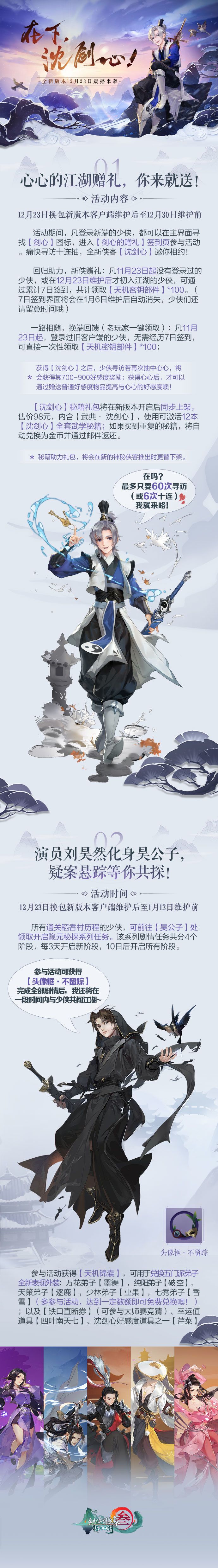 换包新版本《在下,沈剑心!》活动内容长图总结!心心的江湖赠礼等你来领!1、代言人化身昊公子带你探索疑闻密案!完成系列任务即可兑换五门派弟子全新外装!3、12月23日晚21:00,制作人直播约战众少侠!押注有机会赢更多寻访次数!3、全新挂件套装6折上线!叶芷青超武(外观)年末开售!更有强力buff、1元购隐元密令助力少侠行走江湖!