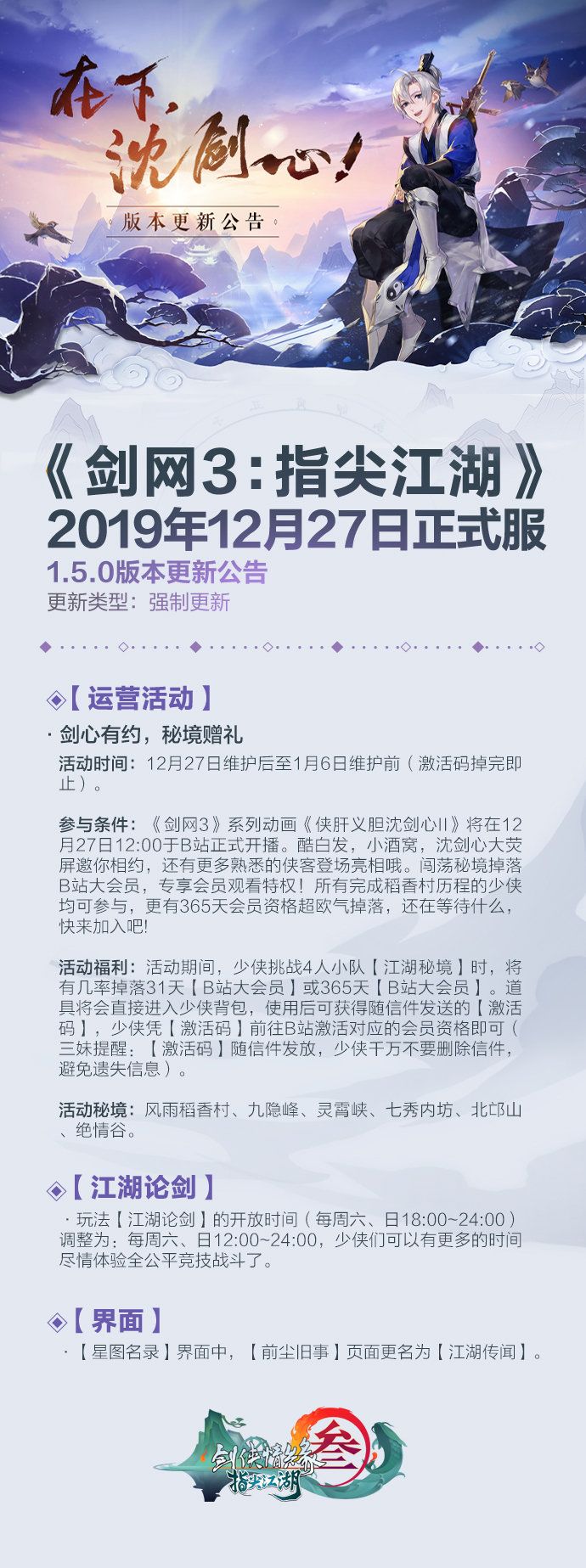 【在下,沈剑心! 正式服1.5.0 版本更新公告】2019.12.27