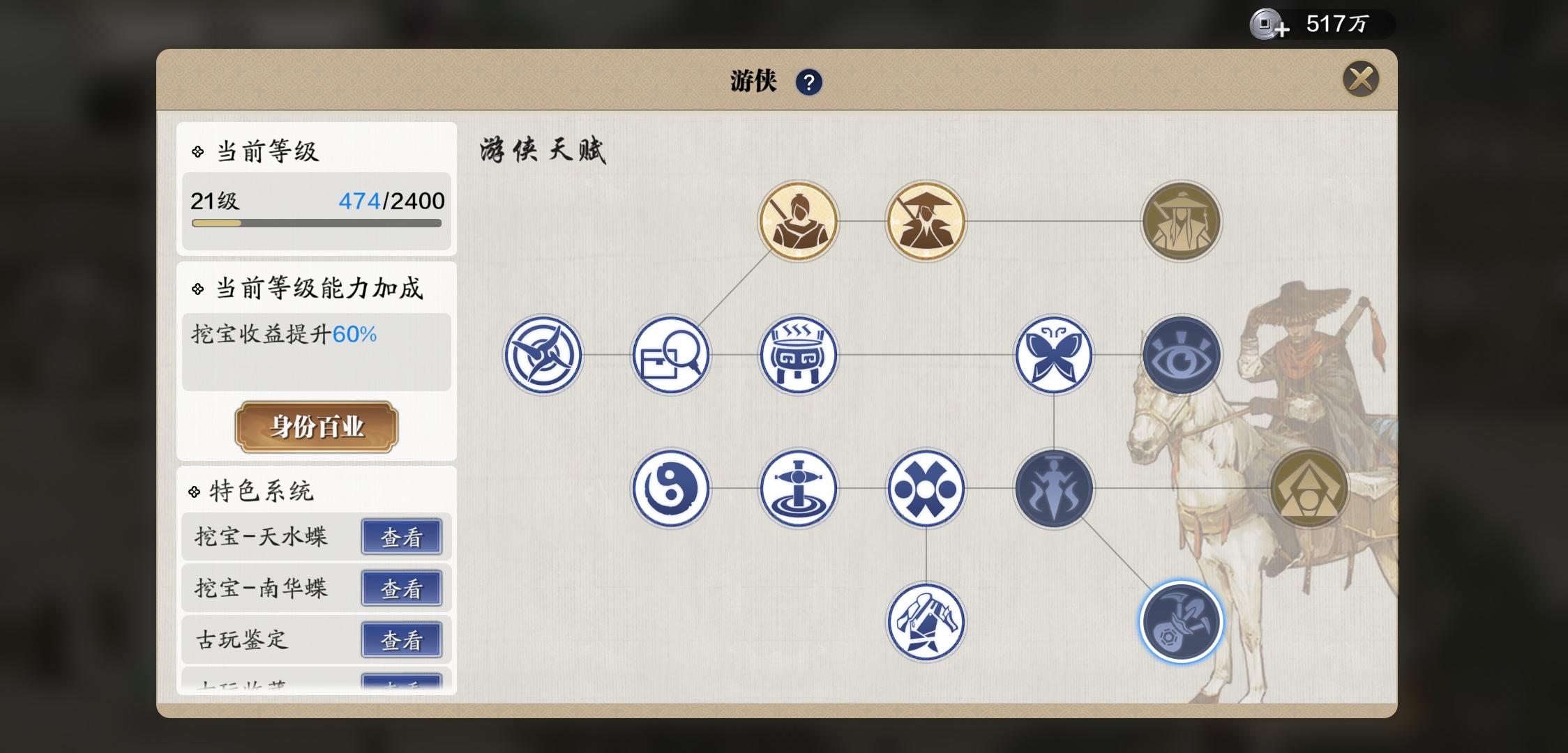 21级游侠,所谓的壁画,首领一次没见过,花式飞毛腿,古玩的绑券银两奖励也没别的副业多,游侠真就咸鱼副业吗?