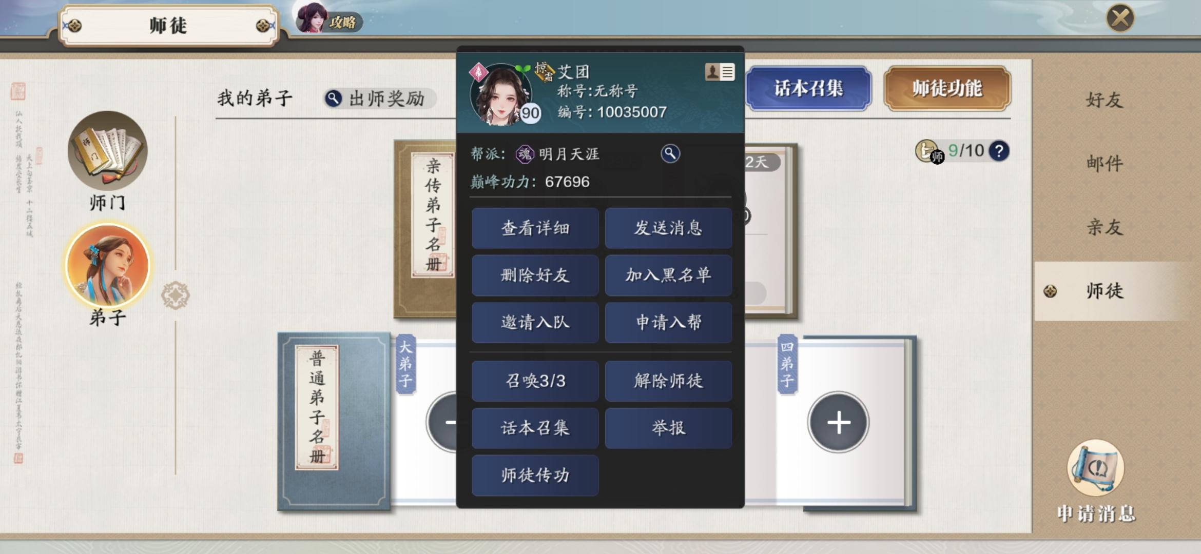 我收了亲传弟子 装备无法传承是什么情况?我俩组队我点师徒里面没有师徒传承按钮,她现在装备全蓝装。可是我没法给金装传承给她。这是什么情况?收徒已经两天了,满足条件(官方看到可以回复一下我吗?)