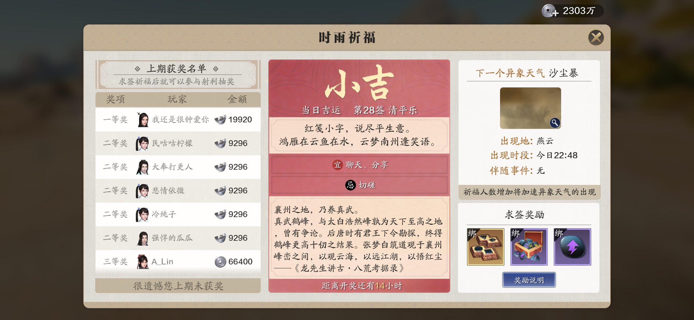 小吉小吉小吉,已经连续一个多星期小吉了。还有从开服到现在半年了,没开过一次大吉。我玩其他游戏也有这种抽大吉小吉的,一个月也能中两三次大吉,果然我们这些零氪玩家,不配拥有游戏体验