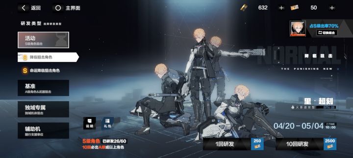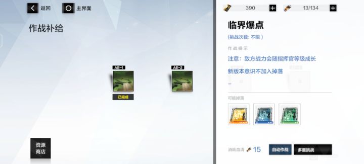 推主线到2-2,转去资源本作战补给,打一次AE-1解锁自动作战,体力砸到35级。领取35级等级奖励2500研发券,研发-活动-命运降临(深红囚影)-一回研发拉满1.出了深红囚影,继续玩。2.没出,基准池抽完,出了三幻神,继续玩。没出三幻神开新号。三幻神:里超刻,比安卡深痕,深红囚影。注:三幻神是版本之子,出不出直接影响游戏体验。这个方法适合多次创号尝试。