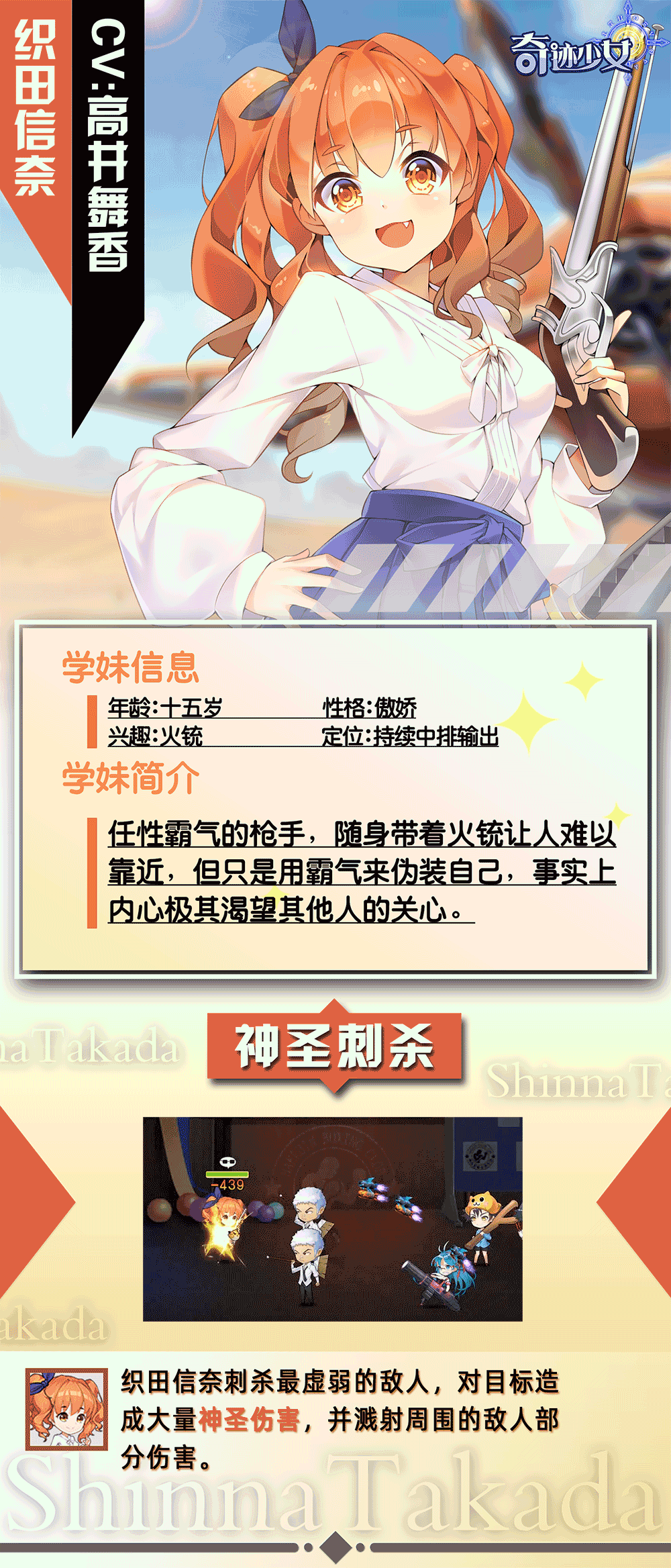 今天为学长介绍的少女是一位来自西部的少女,由高井舞香配音的织田信奈学妹~日常的信奈是一位霸气的女枪手,她随身携带的大火铳让所有人都望而生畏,但外表的一切都只是伪装,事实上信奈内心极其渴望得到其他人的关心。战斗中的信奈是一位持续的中排输出,她会刺杀对方最虚弱的战姬,对其造成大量伤害,并对目标周围的敌人造成部分溅射伤害~今后还会继续介绍更多学妹信息,大家多多关注٩(๑>◡<๑)۶找到我们QQ