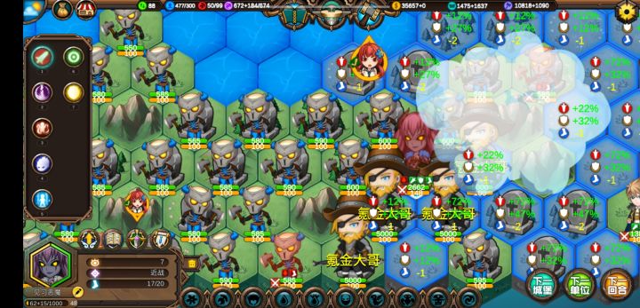 4.元素单位可以通过消耗锤子装备长弓来增加元素融合的距离,初始锤子1000,最多可给25个单位装备长弓。在第一回合道路通畅后蓝方剩余的锤子即为分数,人口低于1580则视为零分。若锤子不够,可在第五回合获得大量锤子。