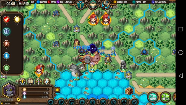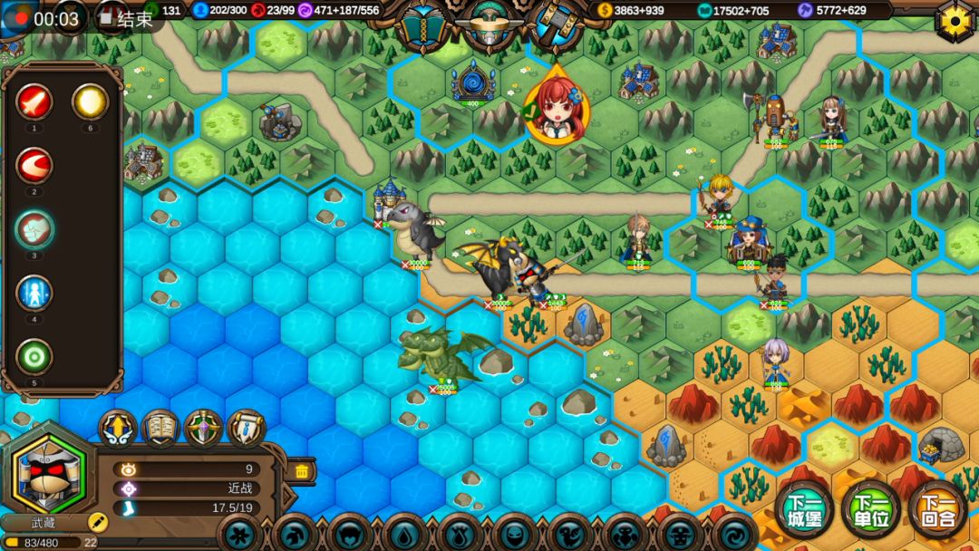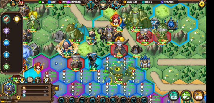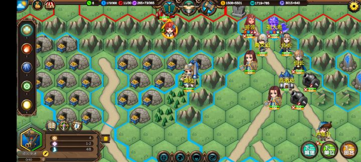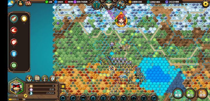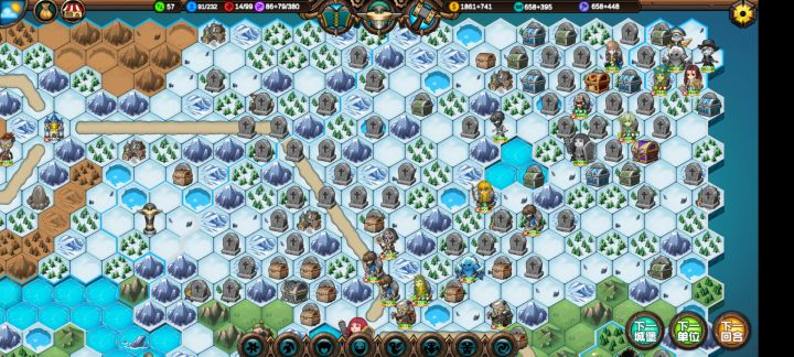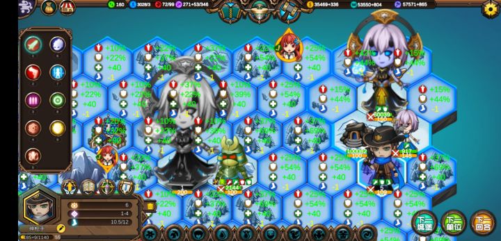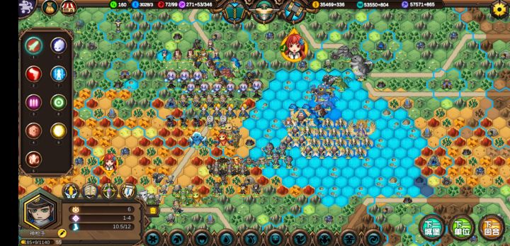 这样基本上可以在80回合之前把地图中间几座城交给ai,然后让招安的首领们来练级。因为大家都是一血,所以奶妈部队也有事情干。然后肃清全地图野怪,别管元素上面是不是攻击状态,直接砍了,都是敌对的会占领建筑。