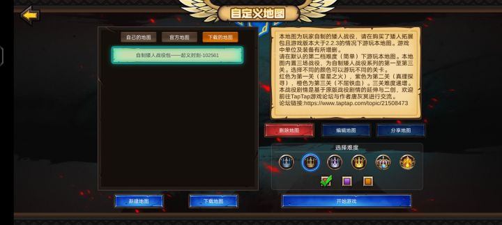 【地图简介】本地图是一张玩家自制战役地图,内置三个战役关卡,在战役中,你将指挥矮人族的军队进行作战。三个关卡彼此独立,你可以通过选择不同的颜色来游玩不同的关卡。由于本地图为自制矮人战役,因此,在没有购买矮人拓展包的情况下无法进行该游戏。【剧情背景】长期以来,矮人族处于人族的殖民统治之下,然而,近期接连不断的战争让矮人族看到了转机,为了推翻人族的统治,矮人族展开了行动。【地图玩法】1选择