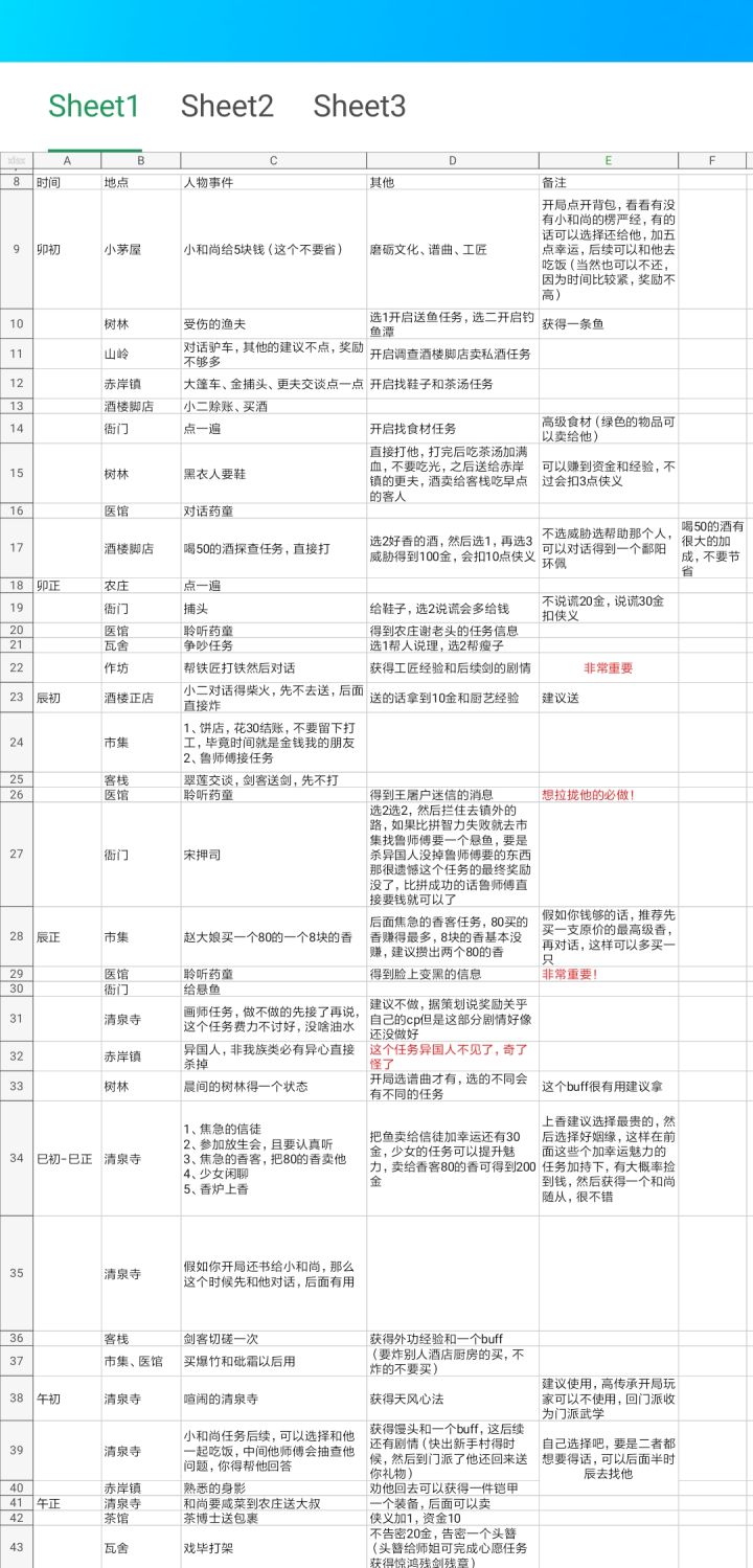 1、开局给小和尚5两银子,会提示去哪里买香,只剩45两,买香前记得先交谈,减很多钱的,记得买两根,另外一个等上完头香卖给焦急的香客,可以卖20两银子。2、黑衣人卖东西,买剑获得精炼铁剑,买帽子获得精致布帽。3、客栈里闷闷不乐的客人要酒,去树林找黑衣人花47两买酒,再给客人会给你100两,如果是找酒店脚楼的小二买早点那买的酒只会给40两。4、前往酒楼脚店-小二赊账,获得3茶水和3饼子,这些东西