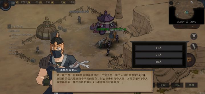 第一题选10只鸡6只兔,第二题选21人,第三题选10天。全答对只需要打赢一个人就行,完了两个部落抢秘宝打起来了,可以帮其中一方,也可以偷秘宝。偷玩两个部落都降好感,得了几个能送NPC的格斗系礼物。