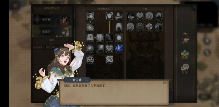 旧档开了无限耐久、告别抽卡,然后DLC全开完了,自身技能页就泰山绝学,搏击,传承。发现学不了技能,然后开了工具包测试,刚创建加入了金玉叶,修改100好感,还是说我技能太多了。