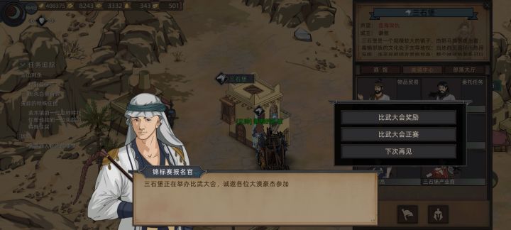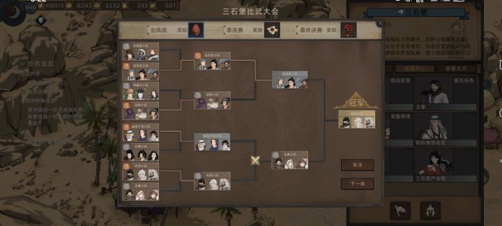 问题是这样的:游戏开档玩赏金猎人,不久遇见三石煲举办的3比3比武大会(DLC开启后那个)就报了个名参加了嘛,结果第一场就打输了,当然了!原因就是我菜,队友也菜!,然后自然就没我什么事了呗!()直接把我提出了比武界面,哎呀!(以前其它档打过比武,直接赢到了最后)当然!输了我也不怎么在意…一直到n多天后当我打到三石煲准备灭了毒蝎时(忙着打江山也没在意比武)看图→发现问题了吗?问题一:这个赛程怎么怪怪的