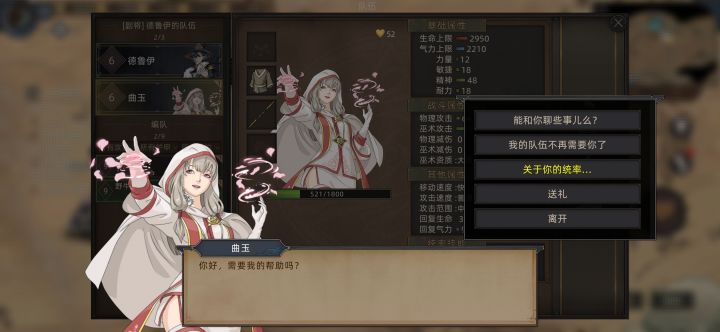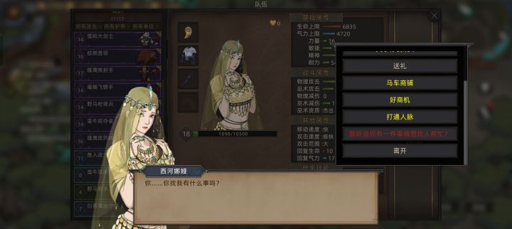 女NPC西河娜娅有个“打通人脉”的功能,之前她是雄鹰领主,我找她做任务时顺手点了这个功能,当时显示她离开队伍去通商,然后只需等几天,她就脱离雄鹰自动回队变成队友咧……
