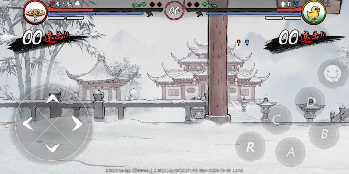 人物在左边墙角的时候几乎完全被虚拟十字键和手指挡住了,我建议把人物往上移,拳皇2012也是类似的处理方法。如果这样处理,人物就会比较接近血条,跳起来血条容易挡住人物,请把人物置于血条之前。一点不成熟的建议,希望无名大大能看到。