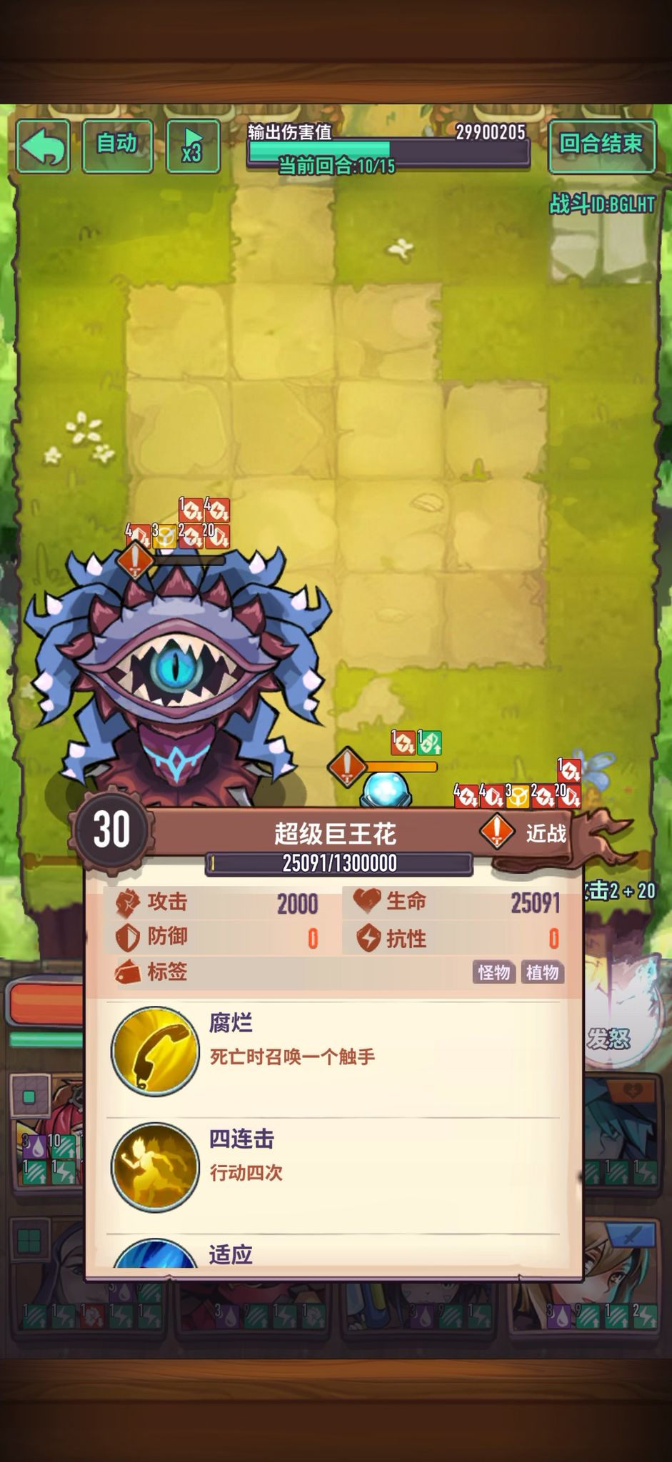①三星条件★BOSS剩余血量低于50% 说明:血量低于50%未击杀也可获得 ★生存超过8回合 说明:需要打满8回合★通关阵容中没有:人族 说明:需要击杀场上所有怪物通关且阵容中没有人族卡星级对应奖励说明②怪物技能技能说明『反应束缚』:攻击缠绕触手后(未击杀)将进入束缚状态,击杀缠绕触手后解除,同一触手只会触发一次束缚,即其他卡再攻击缠绕触手将不进入束缚『缠绕束缚』:回合结束时,未受