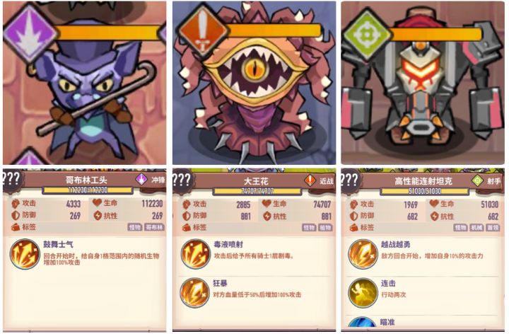 小怪篇第一轮注意优先清除哥布林、连射坦克和在第一排的大王花,可以刷个射手少的开局,这样生存压力会小很多第二、三轮类型①难度指数:★☆☆☆☆ 生存压力:★☆☆☆☆ 过关效率:★★☆☆☆注意点:前排盾猫随层数增加双抗会非常高,但血量少相对好打类型②难度指数:★☆☆☆☆ 生存压力:★☆☆☆☆ 过关效率:★★☆☆☆注意点:下方坦克有回血和护盾,注意优先清除,避免浪费回合类型③难