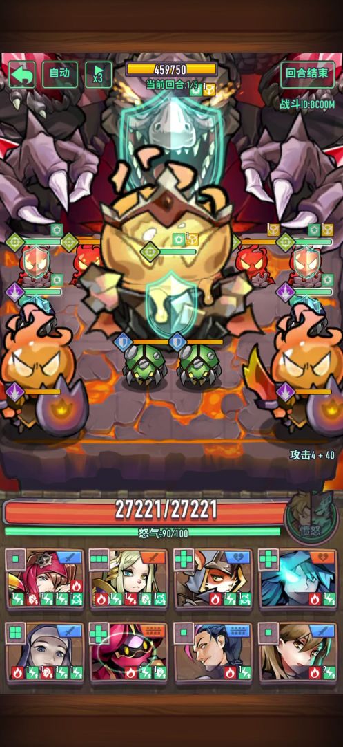 思路是清掉前排两个冲锋怪避免第一回合被锤死,利用汉尼拔士兵做垫子给加哈吃满大招伤害,中间史莱姆可以留着不让BOSS召唤盾守,先击杀BOSS再杀史莱姆即可。