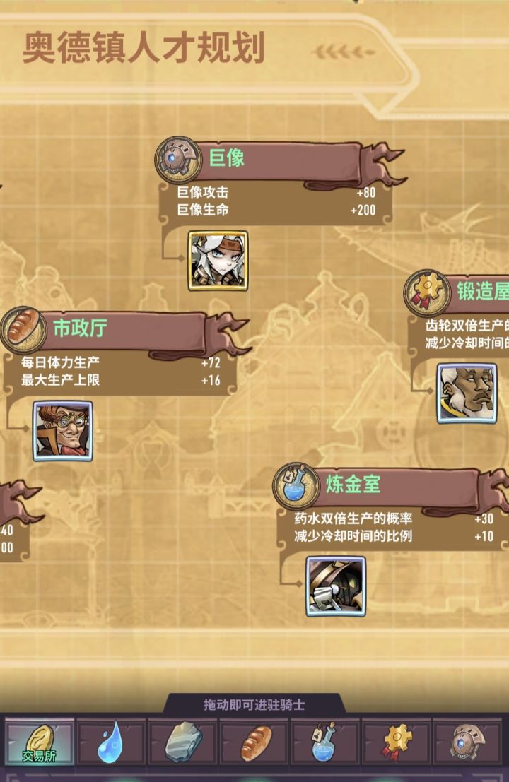 #巨像骑士团攻略征集 玩家id:BKJKT原创攻略:省流前中期天赋升级最低建议:(后期资源多了自己把资源所在天赋补满,优先炼金室和锻造屋凑100%双倍)(优先级红字>橙字>紫字>默认)第一进驻:市政厅->福尔摩斯:终极天赋5级+左天赋6级+右天赋8级(毕业,25万源水)炼金室->拉瓦锡:终极天赋5级+左天赋6级+右天赋8级(毕业,25万源水)锻造屋->主教马扎然:终极天赋5级+左天赋