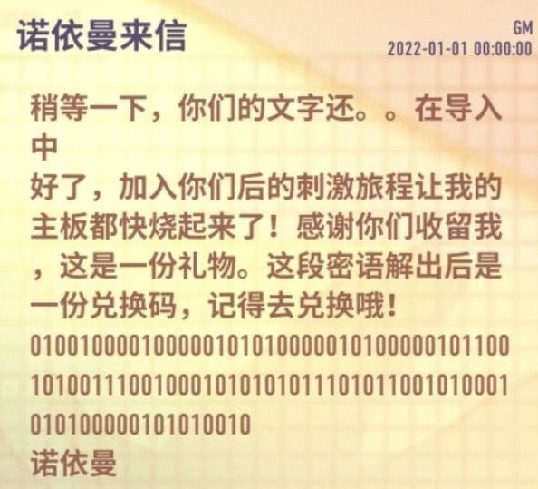 ASCII码二进制对应字符01001000=H01000001=A01010000=P01010000=P01011001=Y010011110=N01000101=E01010111=W01010111=Y01000101=E01000001=A01010010=R所以兑换码就是 HAPPYNEWYEAR