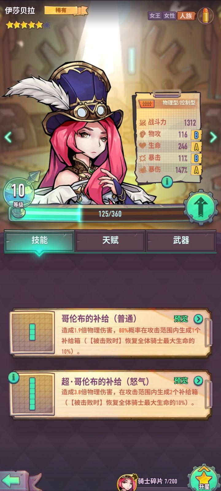 前期开荒好用的工具人,无需过多培养,可以帮助机制过很多关,爬塔和每日讨伐高文致盲针对高攻射手马奇放木桶针对高攻冲锋九日初期极致的输出可以秒掉当然还有一些回复的话,需要用专门的克治疗,例如受伤加 5% 的那个史莱姆,不受木桶限制的怪可以适当用洛夫克拉夫特召唤触手限制。多多利用骑士的各种机制可以少硬刚一点弯路。#浅评一下 编号BK7NQ#巨像骑士团启航测试攻略征集 #巨像骑士团启航测试