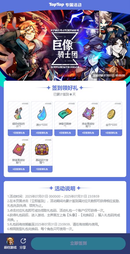 亲爱的镇长大人们!7月签到领福利社区活动即将于7月1日正式开启!欢迎大家前往《巨像骑士团》TapTap游戏详情页参与活动~7月签到领福利签到时间:7月1日0:00至7月31日23:59参与方式:《巨像骑士团》TapTap签到活动页面签到地址:或者前往《巨像骑士团》TapTap游戏详情页的“活动与公告”选项处找到“签到”,点击前往活动页面。活动期间内,累计签到满对应天数即可获得相应奖励