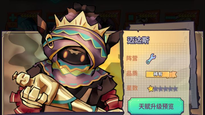 迈达斯“他们叫我“点金手”,所以小心别碰我的手,除非你很想变得很值钱。”阵营:蛋族类型:物理型/控制型品质:稀有擅长:单体伤害技能介绍普通技能:点金手造成一定物理伤害,若该目标为非首领目标将其直接消灭【一场战斗只能生效1次】。怒气技能:粉碎造成大量物理伤害,降低目标一定的物理防御,持续2回合。天赋介绍普通天赋1:盾卫克星对具有“盾卫”目标伤害提升。普通天赋2:会计【进