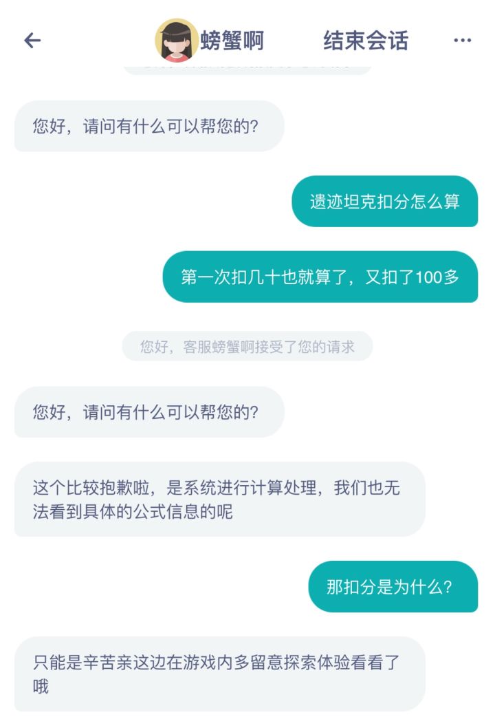 远古bug,遗迹坦克打完扣分,找客服反馈,人家回复请玩家自己在游戏里探索体验!啊?我碰到问题了,反馈了,你这回复是叫我自己克服吗?回一句会跟技术反馈的回复这么难?