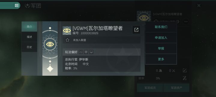 高安低安衔接地地税散人团<VGWM>瓦尔加塔瞭望者新建小军团,目前没啥人,收各路萌新和高玩( ー̀εー́ )目前主要PVE(但是你ceo是个造船仔)壮大后组织PVP(主要反00堵门和抓偷菜贼,抓矿船多没意思😗)PVP爆船可补( ー̀εー́ )<虽然没那个经济实力,但是大家都是挖矿人嘛>q群号:311104758欢迎欢迎啊(。ò ∀ ó。)下面是你团的团徽( ー̀εー́ )有点中二。