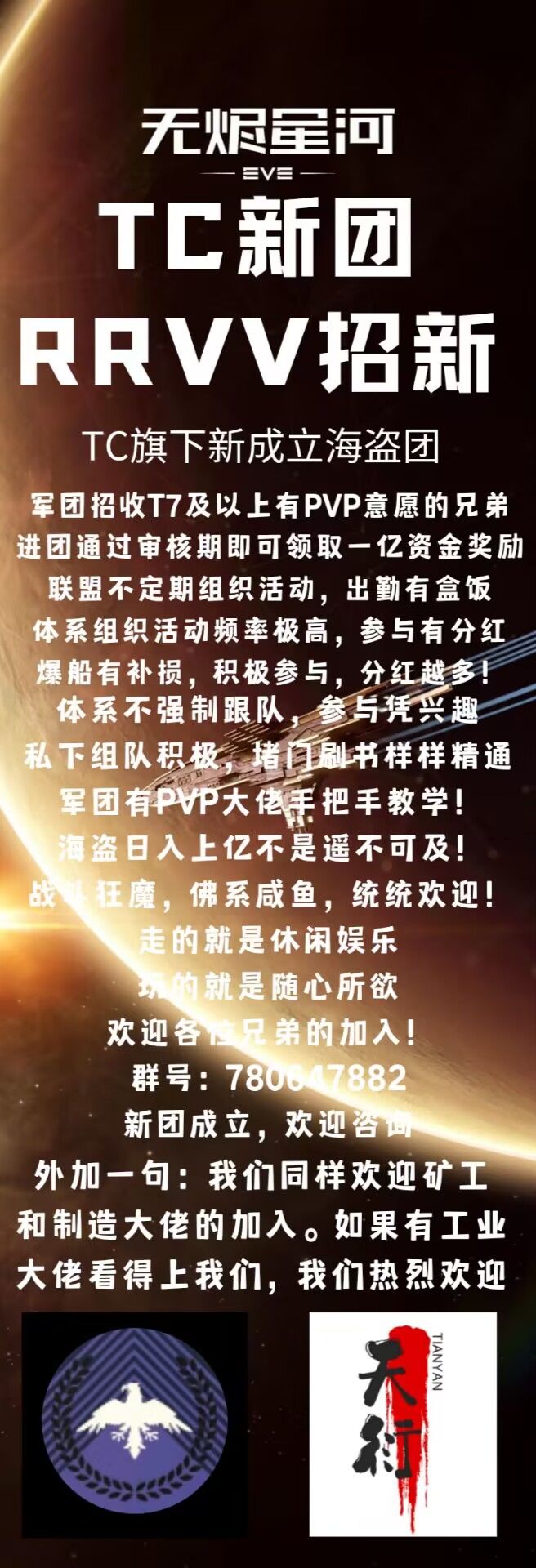 星影矿业招新啦!!!————————————⭐️三块天蛇主权地🌟拥有死角地,生产安全方便⭐️全部3级赏金阵列,赏金多多,赚的多多🌟军团福利丰富,每级发放船只,另外招人更有军团补贴3+2亿⭐️军团集结工资超高,战备买不起军团有补贴🌟军团氛围浓厚,非常活跃⭐️新人入团即领3亿启动资金,老屁股多多,不愁玩不懂☝️有意者请加群927147829详细了解哦!