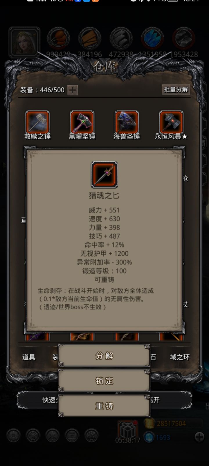龙猎亘古枪+君王手臂,剑豪亘古剑亘古冠带10吸血战利品只开二技能魔石带15概率立即攻击,圣光救赎锤神域衣魔龙心影兽面具古精灵魔石带两个10技巧战利品,神官圣庭灾厄甲肇始心英雄盾乌鸦石+两个10护甲战利品