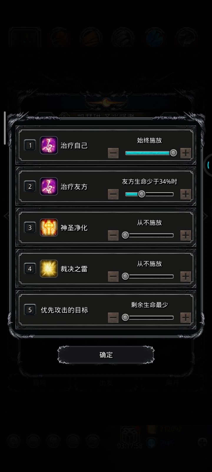 配置抄作业,思路别的大佬都说的很清楚,我只不过改成懒人挂机版的了。基本上狂战先发+火法增幅能把单只小怪打到奶线,或者差几万夜魇补伤害就可以稳过。我蛮子24万,火法增幅灵体22万,蛮子命中大概99,没满,基本上不会翻车。站位从左到右:圣光1,蛮子2,火法3,夜魇随意小怪技能设置:圣光始终奶,蛮子单攻血剩余最多,火法100奶,单攻血最少(三先发),夜魇单血最少。BOSS设置抄作业。伤害低可能