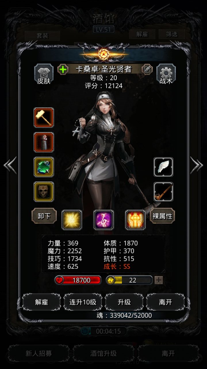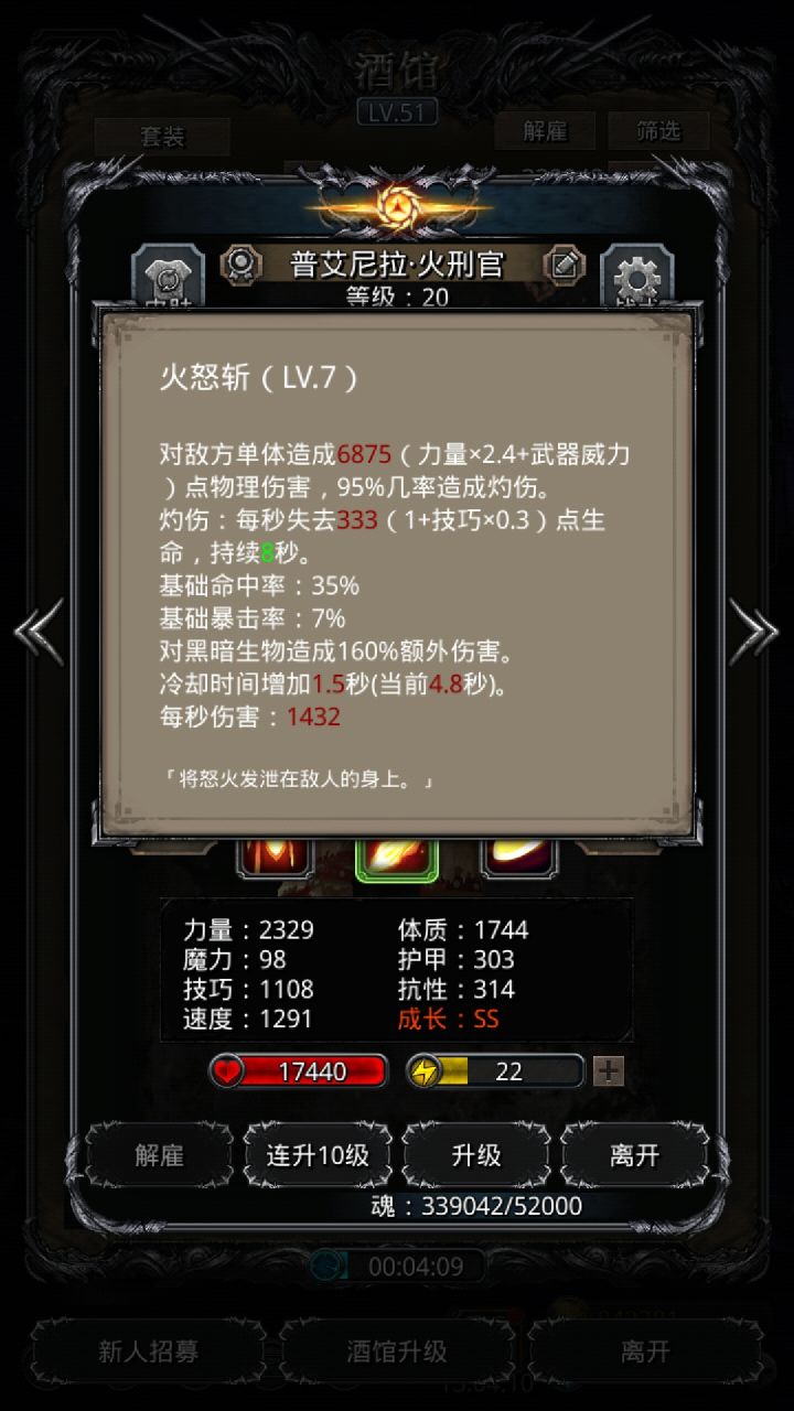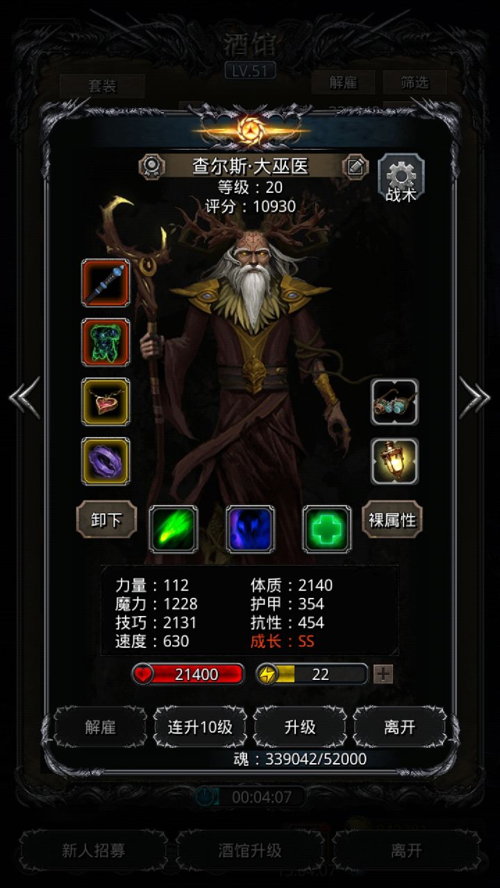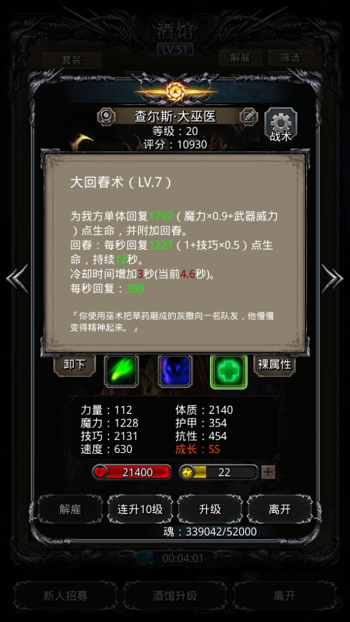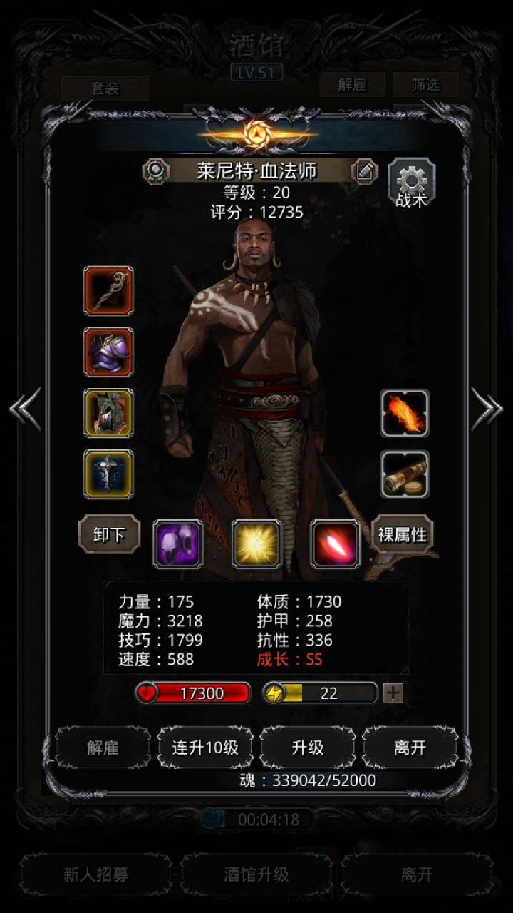 技能设置跟wiki差不多,试了好几种,最后无脑挂机,看豪哥脸色,属性仅供参考。站位:巫医—祭祀—火法—剑豪