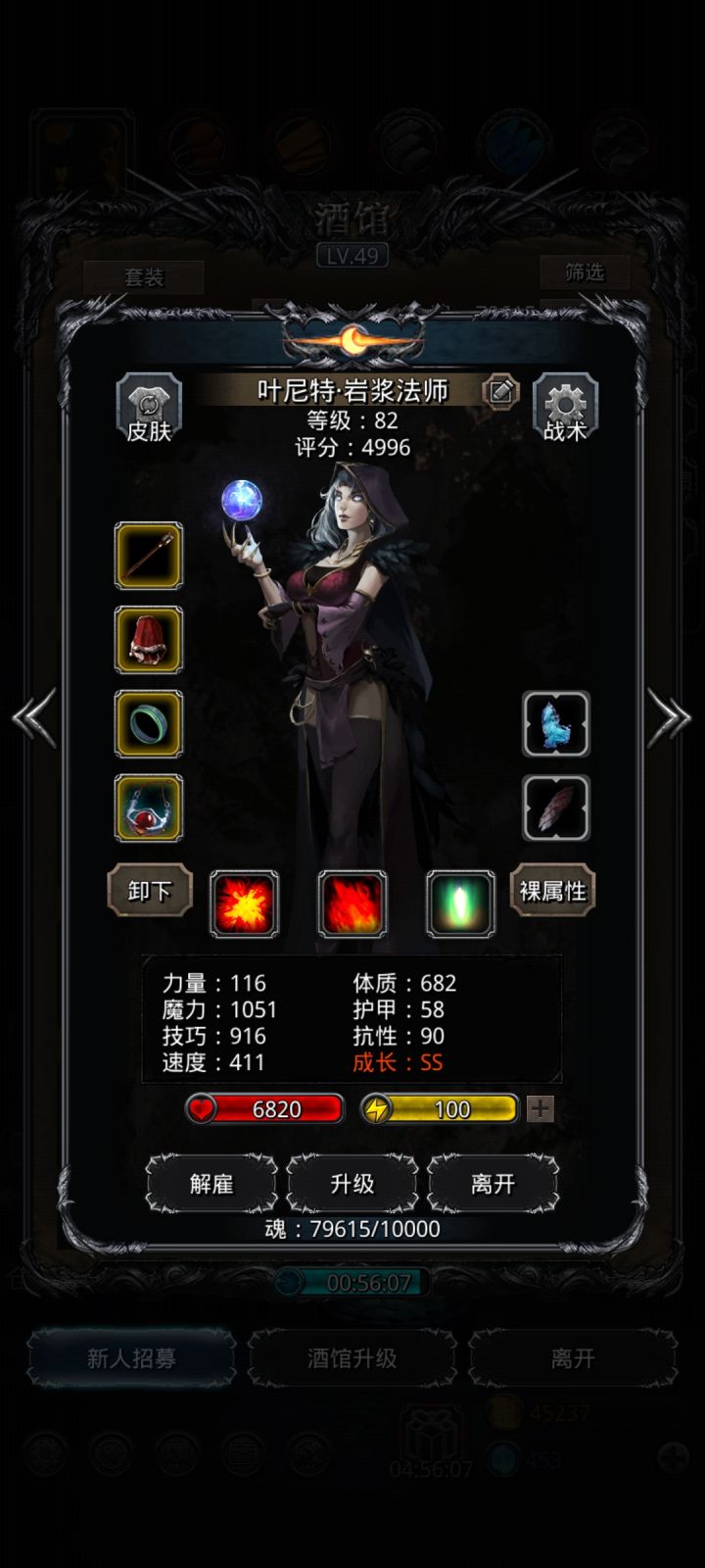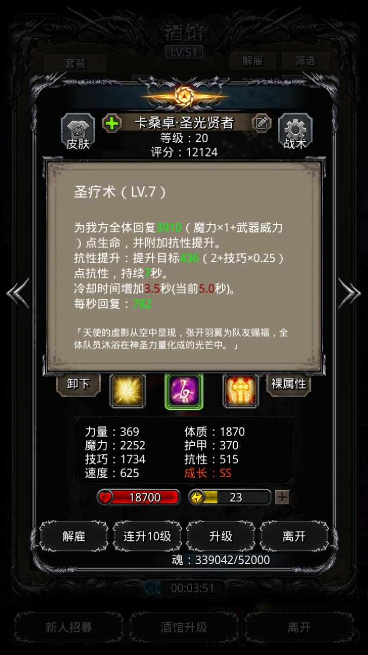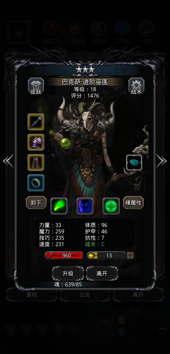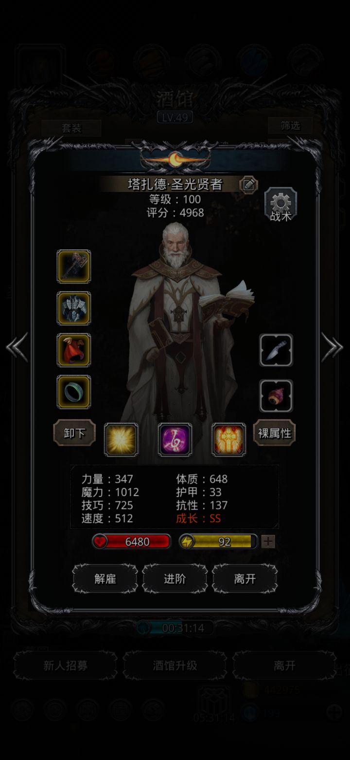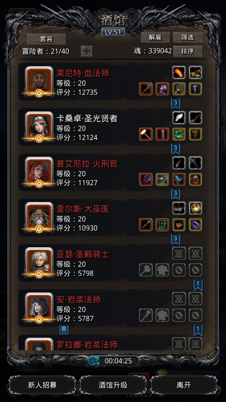 技能设置跟wiki差不多,试了好几种,最后无脑挂机,看豪哥脸色,属性仅供参考。站位:巫医—祭祀—火法—剑豪