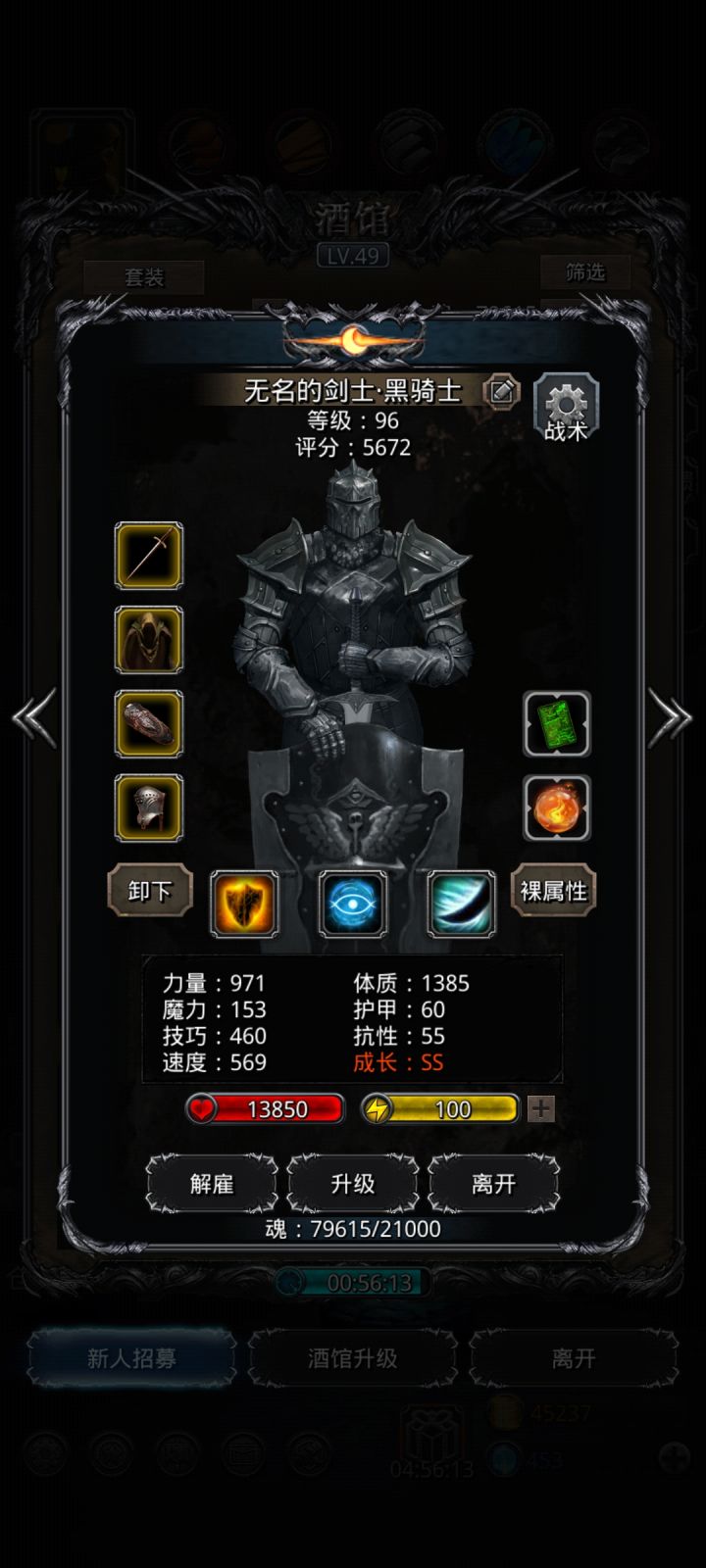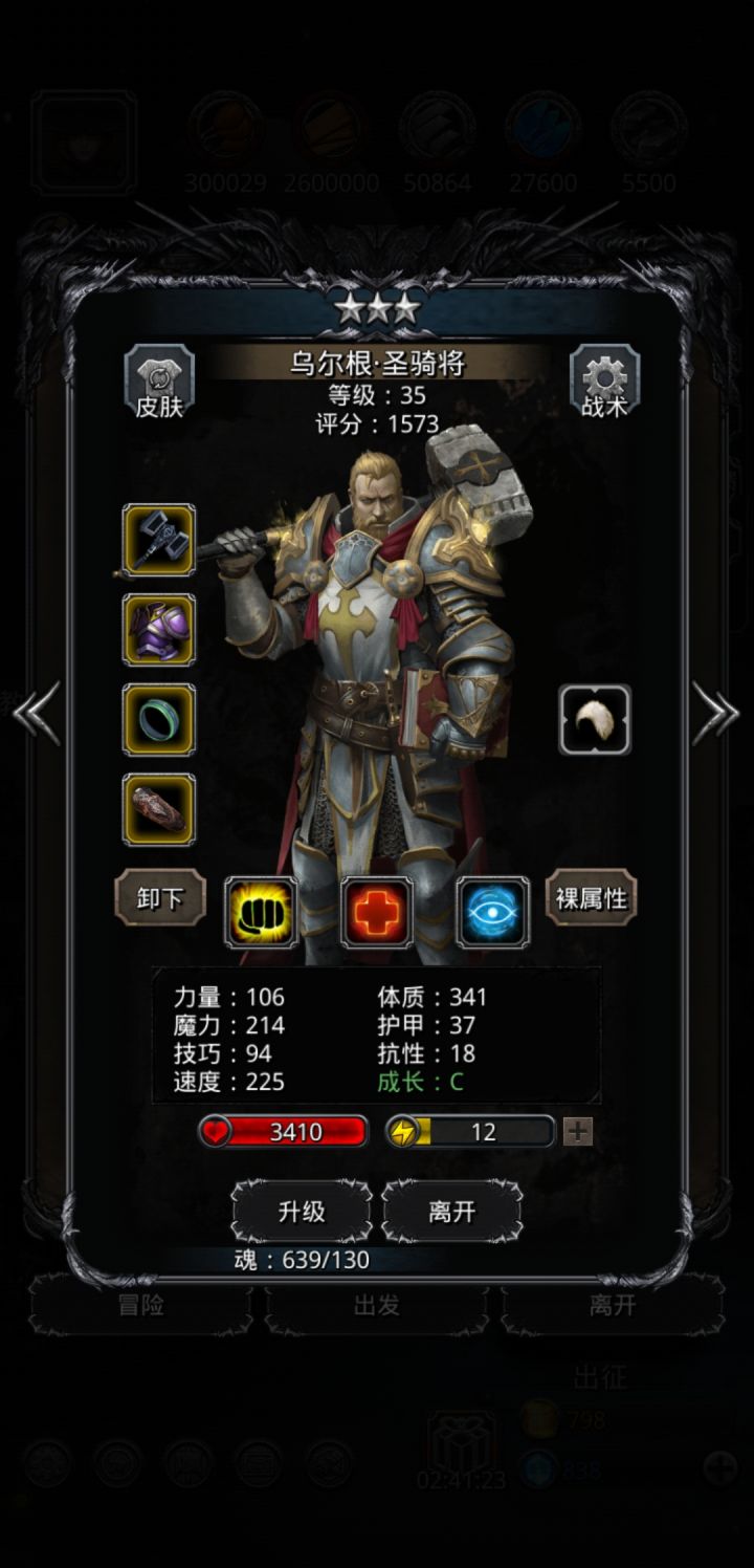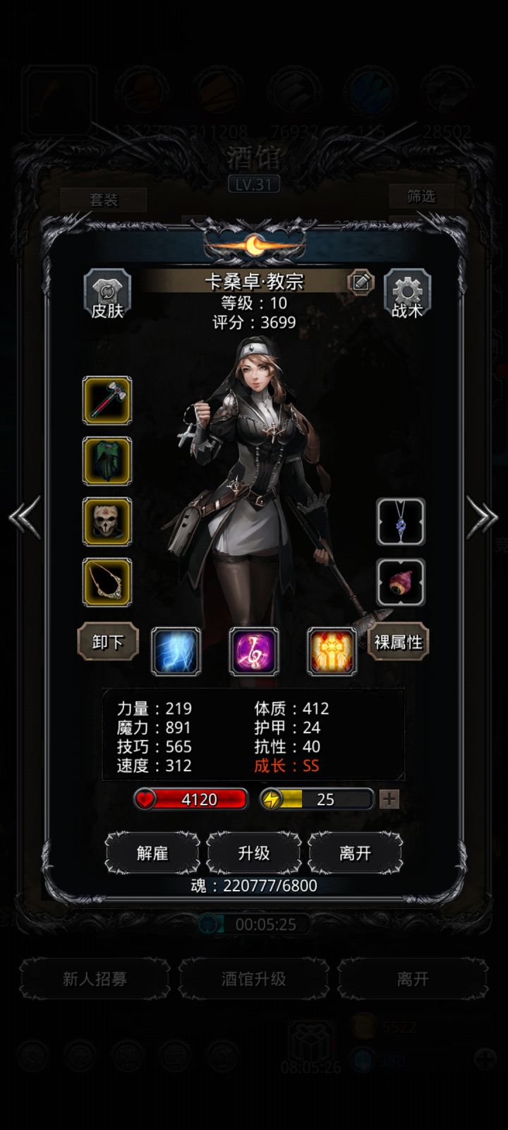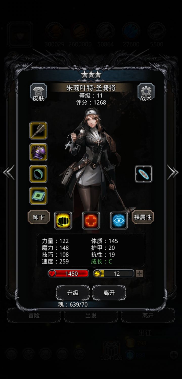技能设置跟wiki差不多,试了好几种,最后无脑挂机,看豪哥脸色,属性仅供参考。站位:巫医—祭祀—火法—剑豪