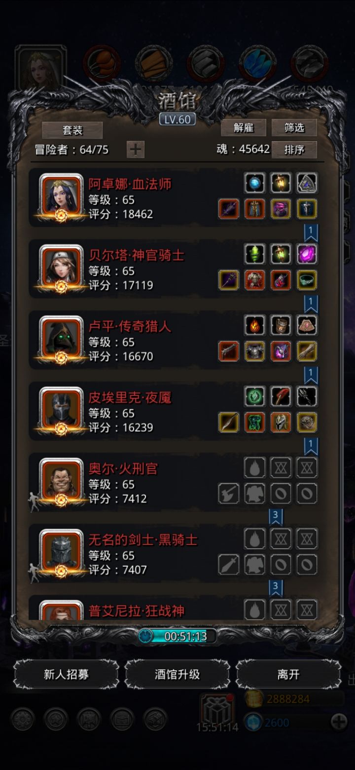 卡了将近一个星期,裂隙68终于过了,4:32打完。输出绝对够。血法双吸血,刚开始带的魔龙,打BOSS会miss,换成未名,命中47%。夜魇单吸,带的灾厄,主要不被秒,都能吸回来。神官亘古最稳,带先发。操作:小怪,血法单挑;BOSS复活队友,注意:打BOSS前检查一下队友配置!!!神官先发奶传猎,然后奶自己,接着就手动:传猎—自己……循环我是5柱80,火枪69,102锻,仅供参考。