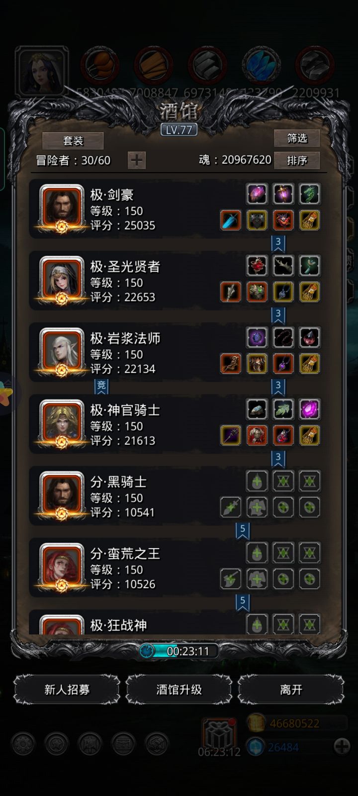 分享一下我挂机过62的阵容、方法,希望对没过的人有个思路!魔石都没满,我一会发人物属性,你们可以看一下,就圣龙的暴君石头满了,但是也没什么用,就是为了加体质!配装如下 1号祭祀:坚盾,神域,风精灵,戳魂,回复战利品一直奶 2号祭祀:救赎,绿甲,献祭头,船长回复战利品90%奶 火法(传奇法师更好): 支配者,暗物质,绿心,死灵魔力战利品95%奶 圣龙 凯旋,亘古甲,英雄盾,魔龙心,技巧战利品,可以
