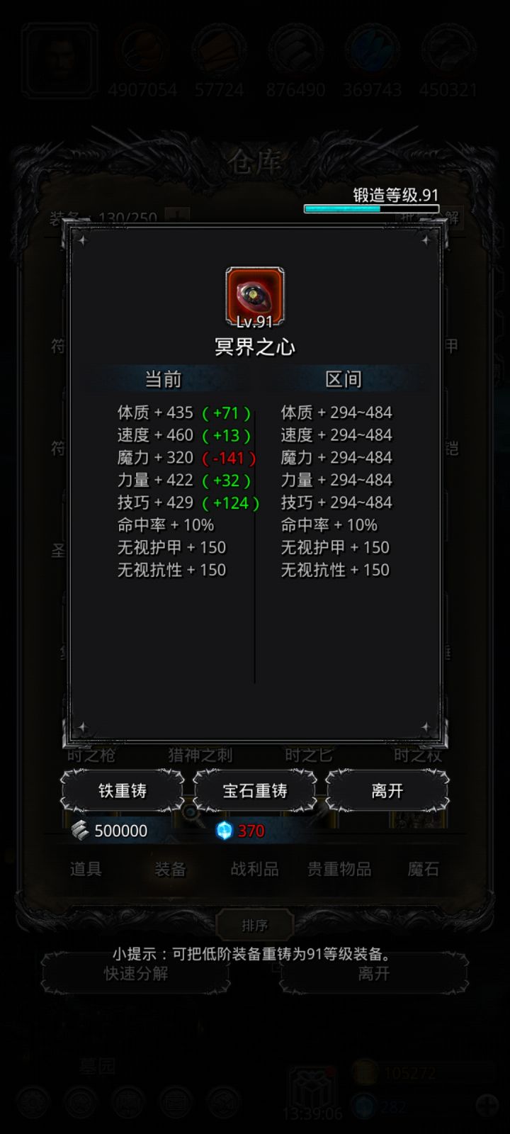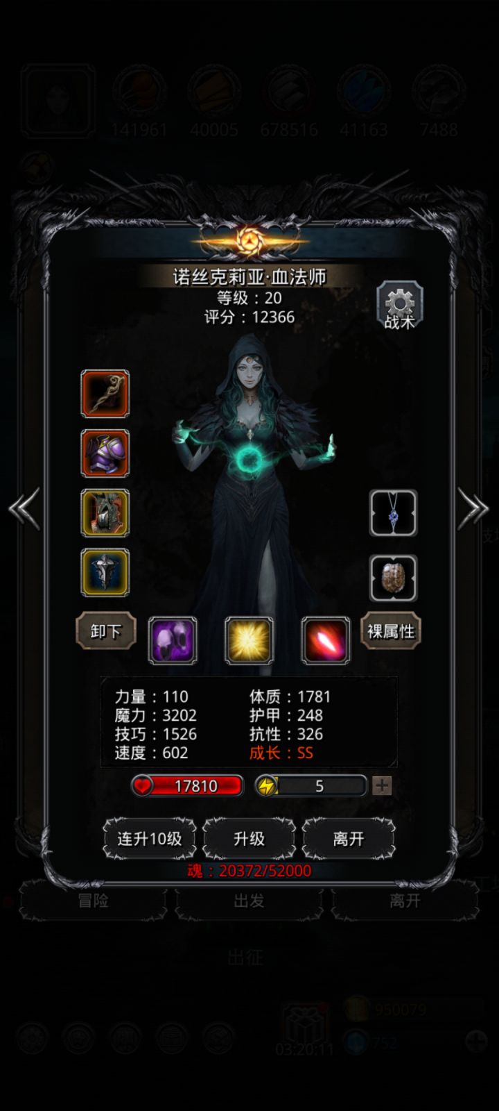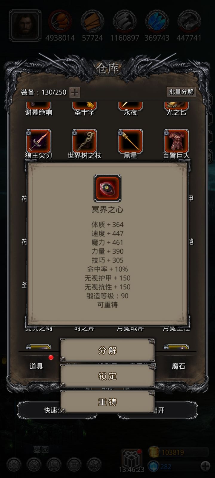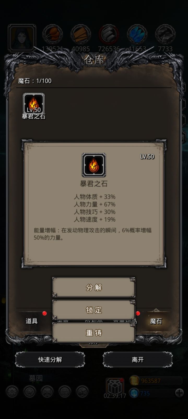 感谢各位大佬的建议,终于过了噬魂带弟。下面是我的配装,给以后要打噬魂带弟的玩家一个参考。😁😁😁萌新第一颗魔石,以后加入赌石大军😂😂