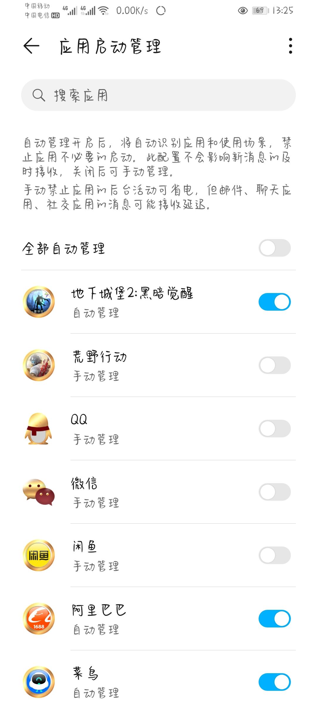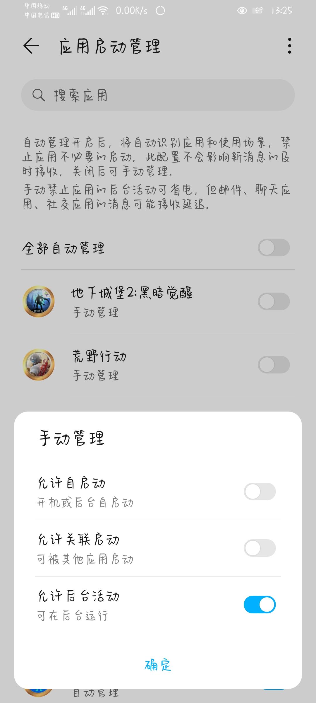 关于手机游戏后台不能运行的问题,不停开游戏关游戏闹心。不多说,直接上图。华为手机为例。手机设置-应用启动管理-游戏默认自动(改成手动)-弹出页面,第三个允许后台运行。👌