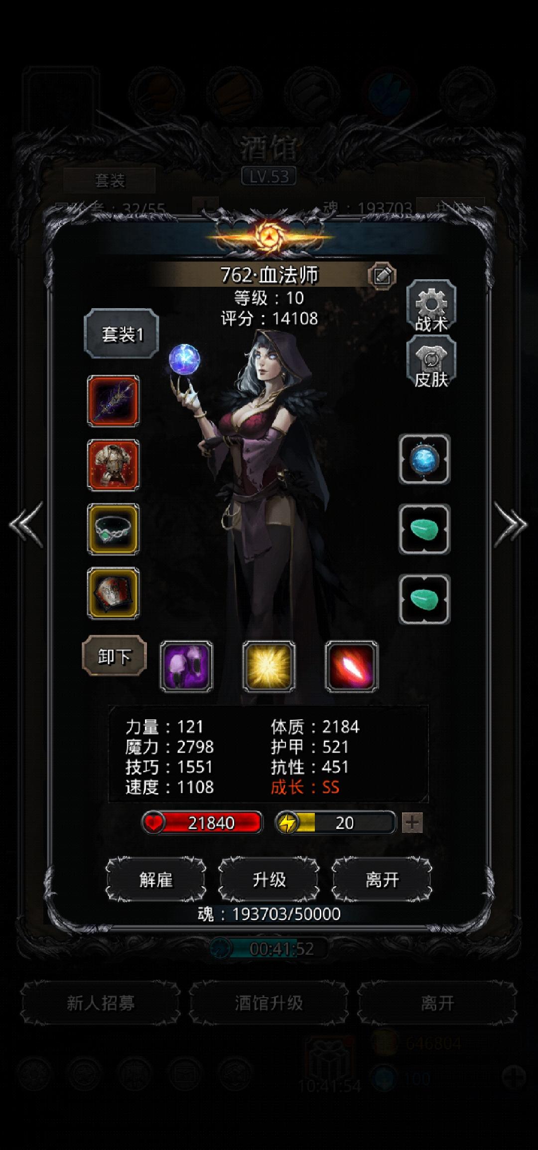我在TapTap搜了一下,很少有ss-的就发一个以供参考吧。PS:有魔爆剑豪的甲也可以用巨兽代替,输出好像差不多。。。说一些可有可无的注意满命中,怪的速度1400夜魇是单力双速冠 力速满的。。