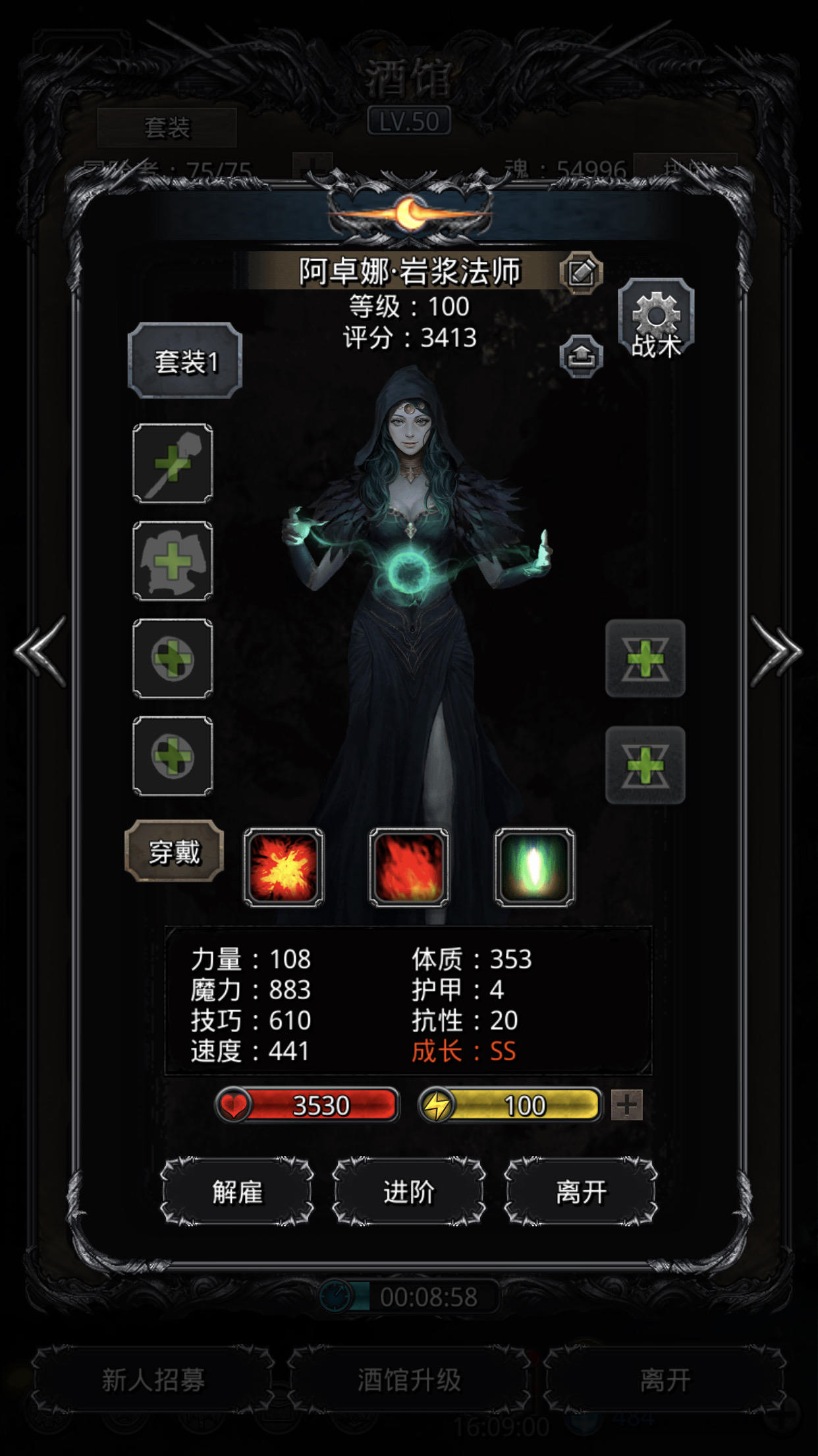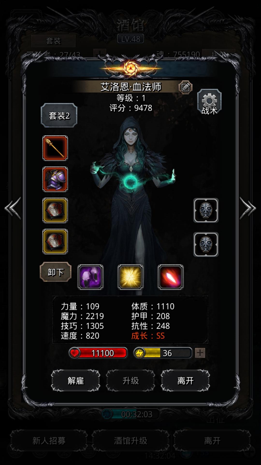 感觉再也没有人可以过的比我更极限最后关头巫医不要了,保住了奶妈一次,最后就剩火法打了一下就结束了(幸好没有miss)没铁锤了队伍配置是巫医加祭祀加火法加传猎,属性图:红冠是高体高技的,不敢再锤了传猎的魔石是15命中,打触手102的命中,之前没洗魔石99命竟然给我miss了一次,火法的魔石是15增幅,打触手97的命中,巫医的魔石特意洗了一个15概率增加100%技巧(特效一出瞬间救场,加上火