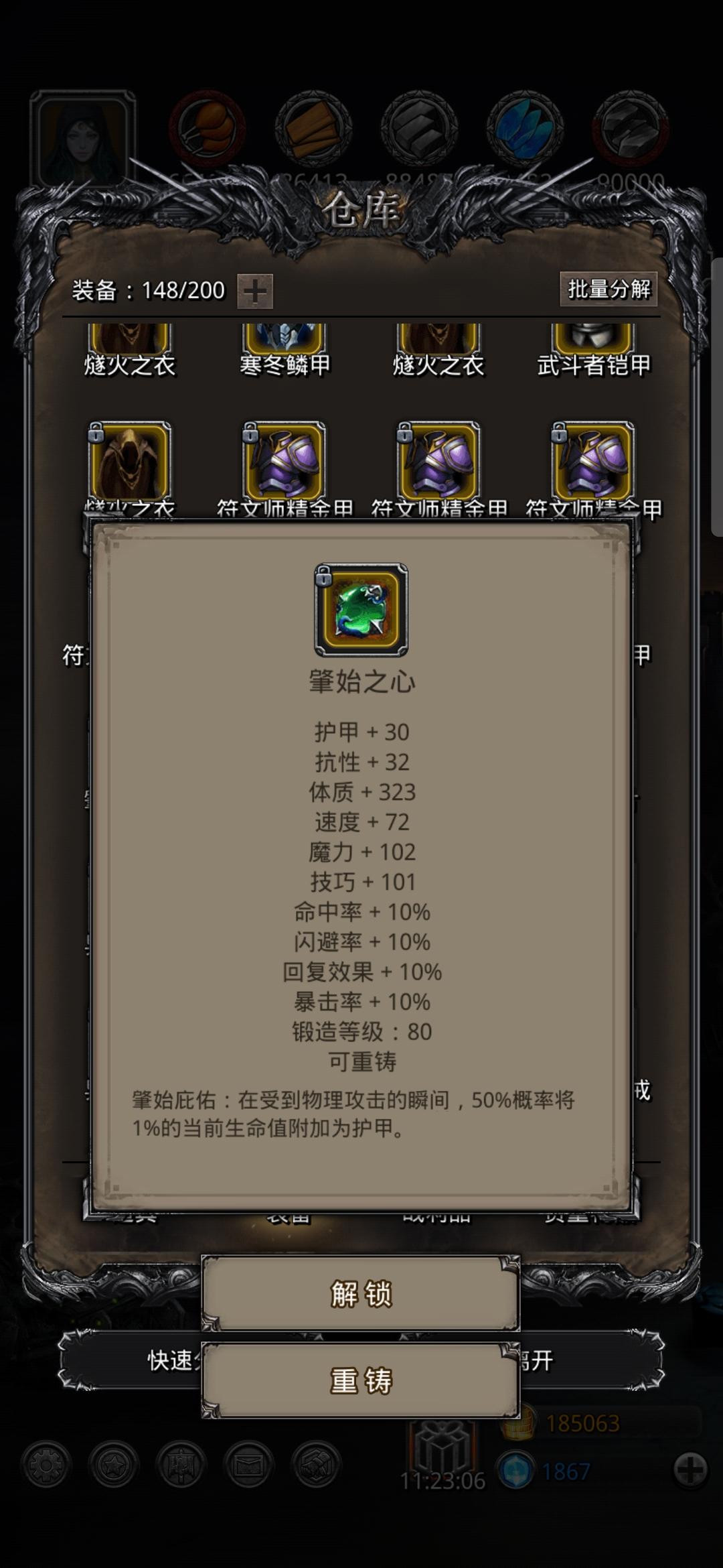因为找来的狂战都不怎么好,券了,所以只有一个垃圾狂战,就想到生命流失血法,自带月杖月斧重点是记得压低岩浆法师的血线,去裁判所记得只给法师留件衣服,遇到石头人加2小兵基本血线就可以卡稳,进去夜宴重伤,法师剩1000,脸好的3343稳过,像我就只能3432,运气好剩剩了20s下面上属性图,就是下限之心让我难受法师那个戒指是元素之戒,几率加20魔,可以换更好的代替