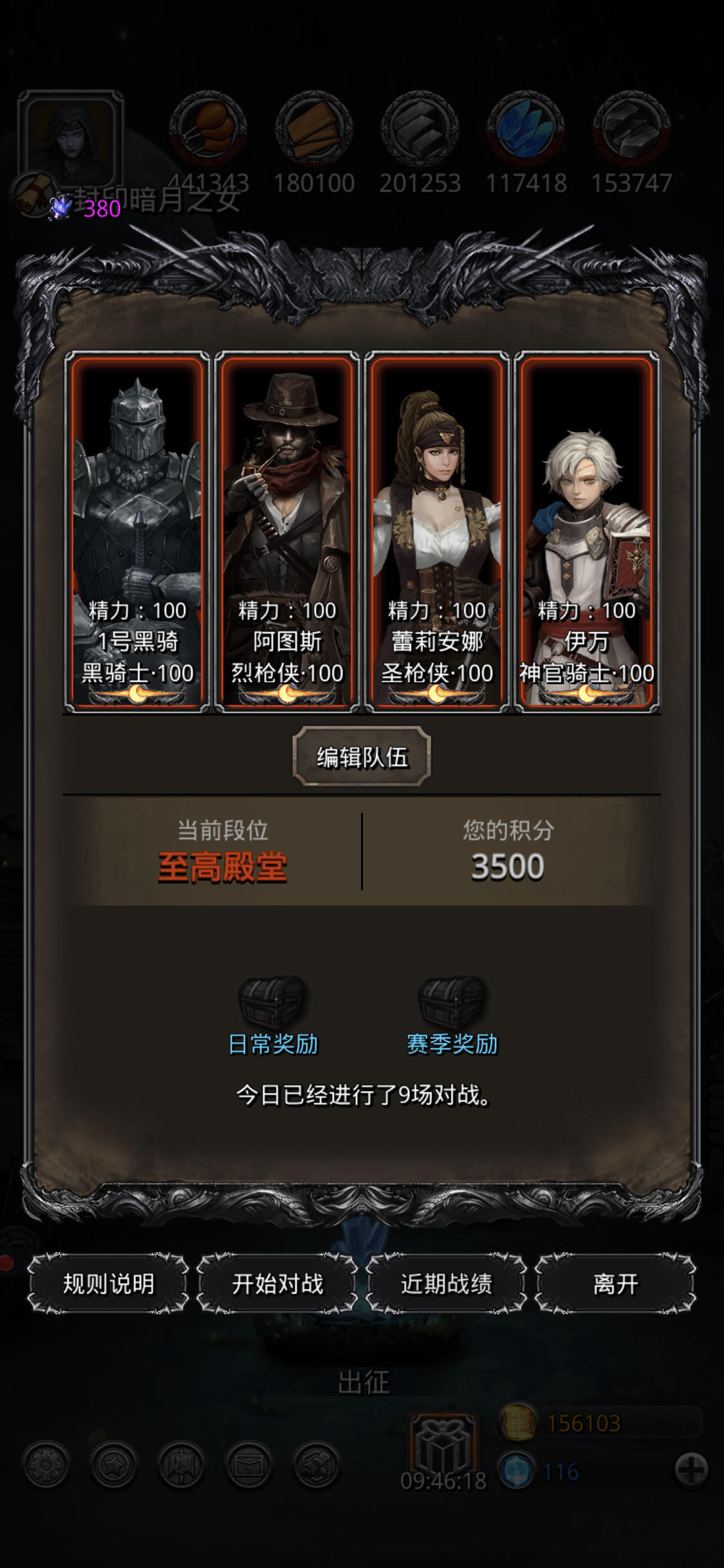 这套阵容比较怕法队,单是鉴于月阶法队比较少,几天都碰不到一次,所以整体胜率还是挺高的,基本能稳定在75%以上,装备详细配置如下黑骑主堆护甲体质,带先发战利品,过了图16的小伙伴应该都有一个,穿法袍是为了防止上来被先发的法师秒掉,战术设置始终嘲讽开盾击。烈枪主堆命中技巧,力量差不多就行,竞技场很看力速比,在两边都有先发的情况下力速比低的出手更快,只要能保证枪枪命中输出就不会低,有浩劫跟先发更好,