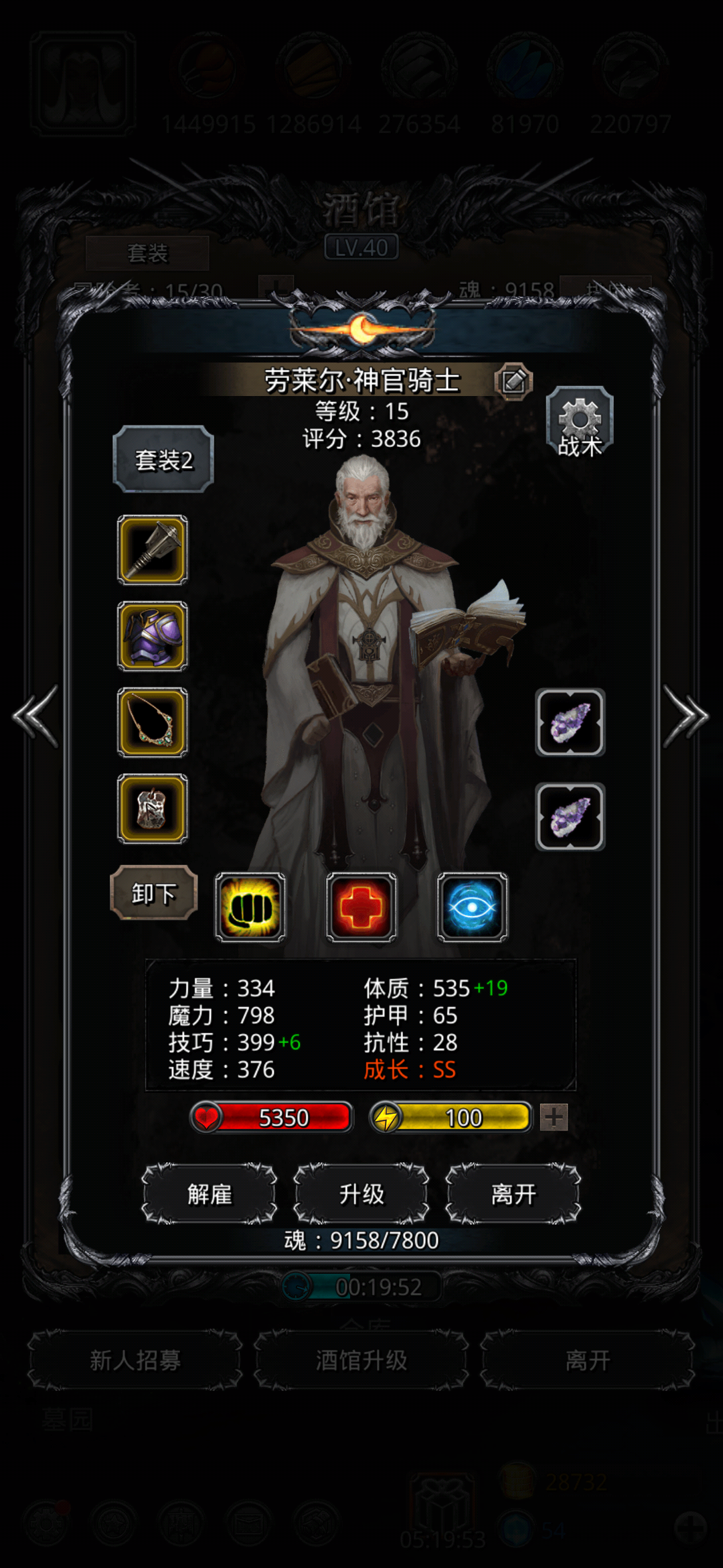 打法,法祭圣按照网上的技能比例就行黑骑25嘲讽虚弱始终,3万血的时候圣骑手动给祭祀和法师加血血满的也加主要为了加护甲,那个血总量少就先加那个防止狂暴以后两个群攻直接被打死,最后就可以慢慢磨死她了。感觉我的这个阵容需求还是挺低的希望有人能用的到。