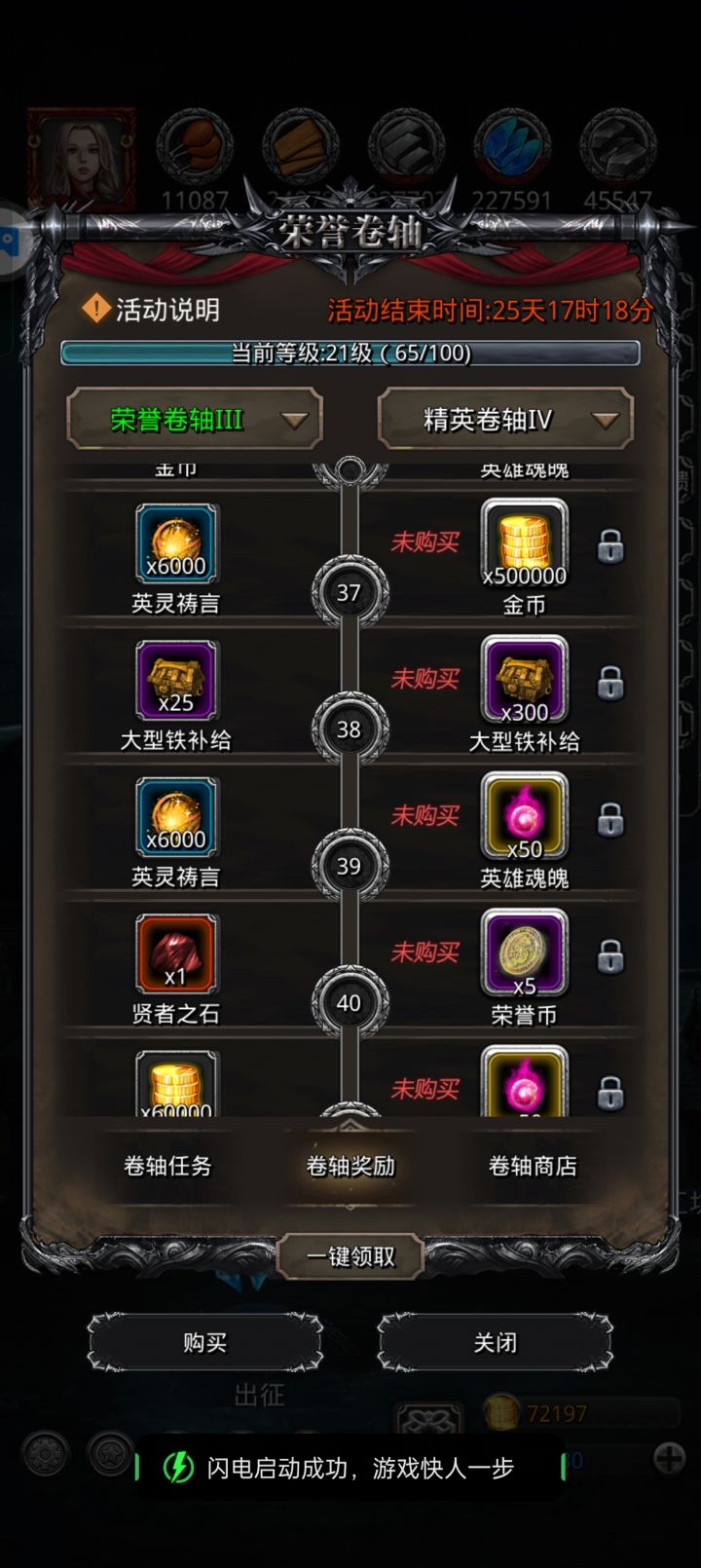 现在差10天就可以拿到独裁者。如果在25天内打通被遗忘者的话,开卷轴直接可以领到四级的收益,现在感觉三级也是不亏的,开了直接很快的提升进度。四级就没有英灵祷言了,据说刷红石需要很多,所以三级这个还是不错的。但是金币感觉很少,贤者之石也不多。氪一个三级付费资源≈6×2×300000=3600000金币,一次冒险24,000金币,一天冒险两次,那就是7天的资源9×6=54个贤者之石,之前算