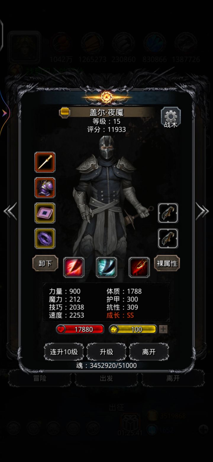 具体配置如下:①黑骑先发必备(我这里装的是图16送的先发战利品)护甲250左右,小怪嘲讽+晕眩Boss初期也是,两个小怪清完后关掉嘲讽和眩晕,开肾虚刀补伤害②神官一定重视力速比在1左右,这样重伤能拉两波,防止护甲buff有空档期。先发也有用,但是用处不是特别大,技巧还是优先的,此处奶量2400左右,提升护甲134(因此用了深海和国王加速度)尽量全程手动。小怪:两个的时候就奶黑骑,一个的时