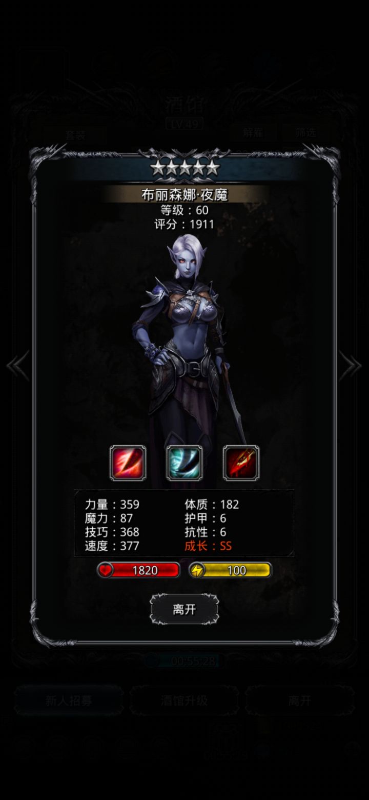 大家不用去看巫医阵容了,没有一日真的打不了,突破加技能概率。除非能保证巫医速度快一直晕两小怪,黑骑能晕女刺客。攻略阵容关键点是有红甲做了随便打了,黑骑单晕一小怪以后神官奶黑骑高护甲,可以在2分钟左右过女刺客。本来就是一个挂机游戏,也不用充钱,不用省资源,尽快做2件红甲,力量魔力各一件能蛮多boss的死了很多次总结出来阵容,黑骑夜魇神官狂装备黑骑遗迹剑(黑骑体质加护甲)流血甲或者红甲,