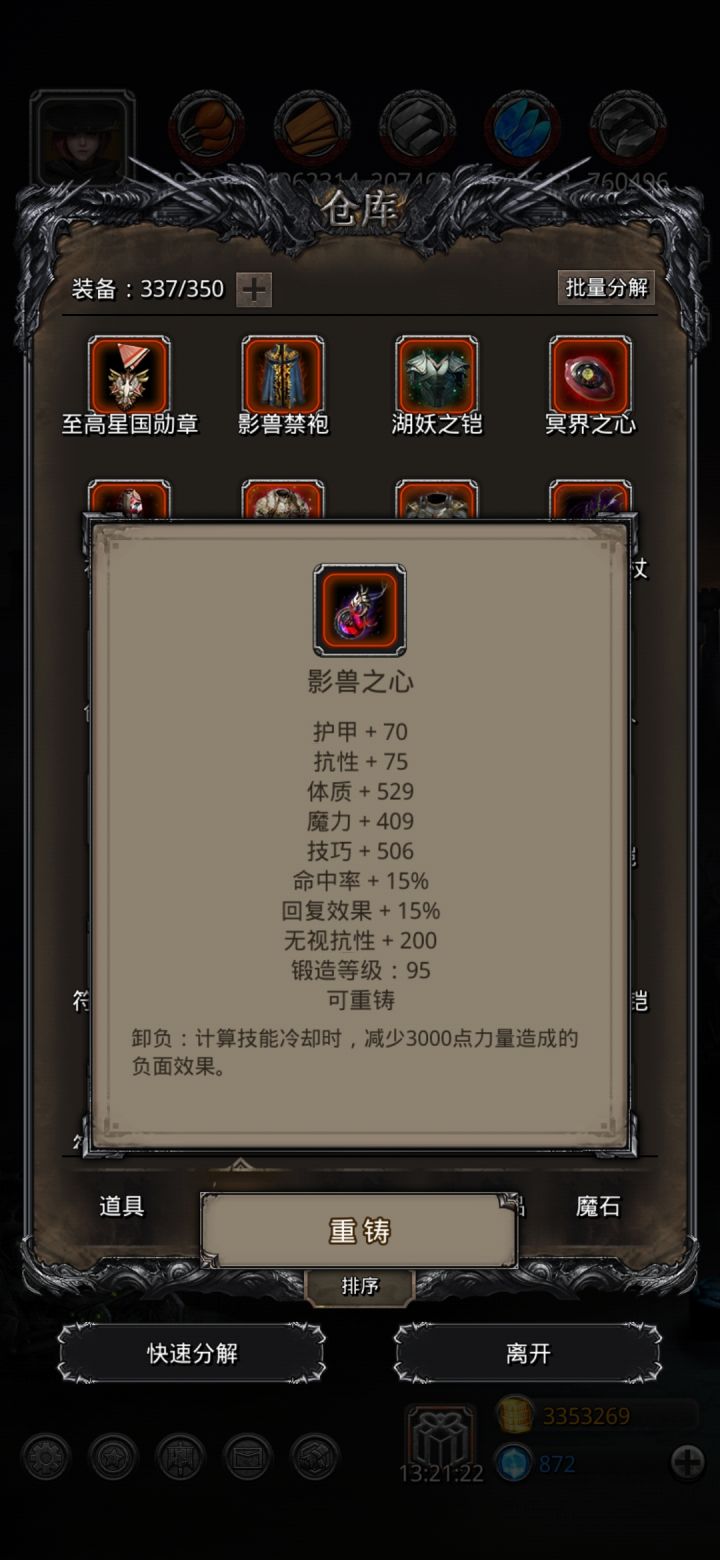 过了过了,感谢阿飞和问天。之前总是在洗15异常,浪费了很多红石头,应该有一百个吧。已经咸鱼了2个月了,影兽还没通关,今天看到上面两个人发的贴,只要三个命中魔石,好家伙,装备一凑,67影兽3次就迷之通过。要是早点看到😍,(´-ω-`)我的石头就不会亏那么多了啊。