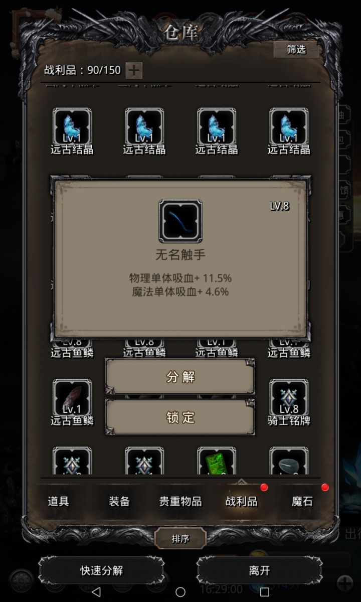 配装如图,全月百了才过!!!按照wiki的两个重伤法和黑骑硬抗法,打了很多天都过不去!!!距离过关最近的一次是wiki的第二个重伤法,即图上阵容,当时输出差一点,就差2w多的伤害把BOSS打死,结果BOSS直接团灭了我的冒险队!后面试了其他方法都不行,又回到这个阵容升级冒险者,直到两个月百+两个月90打满5次依然过不去……直到昨天全部月百再试,终于过了!!!打到最后还剩2-3w血时圣枪挂了,火